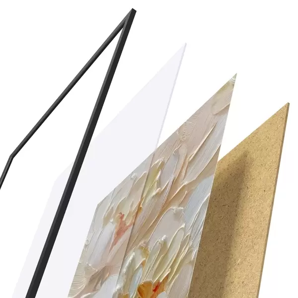 De poster bestaat uit een frame, plexiglas, geprinte afbeelding en spaanplaat achterkant. De poster kan meteen aan de muur worden gehangen dankzij de bevestigingen op de achterkant.