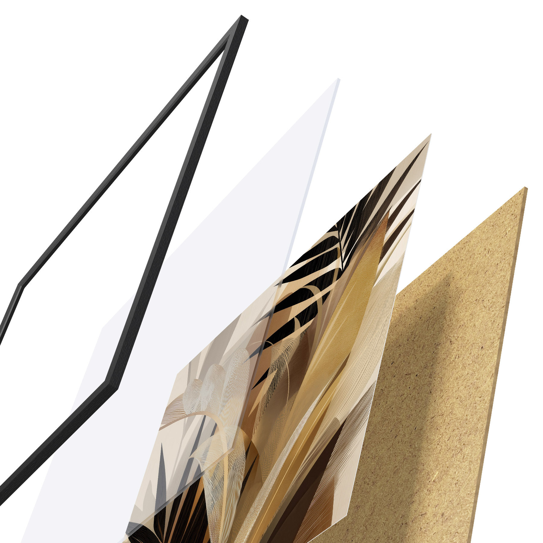 De poster bestaat uit een frame, plexiglas, geprinte afbeelding en spaanplaat achterkant. De poster kan meteen aan de muur worden gehangen dankzij de bevestigingen op de achterkant.