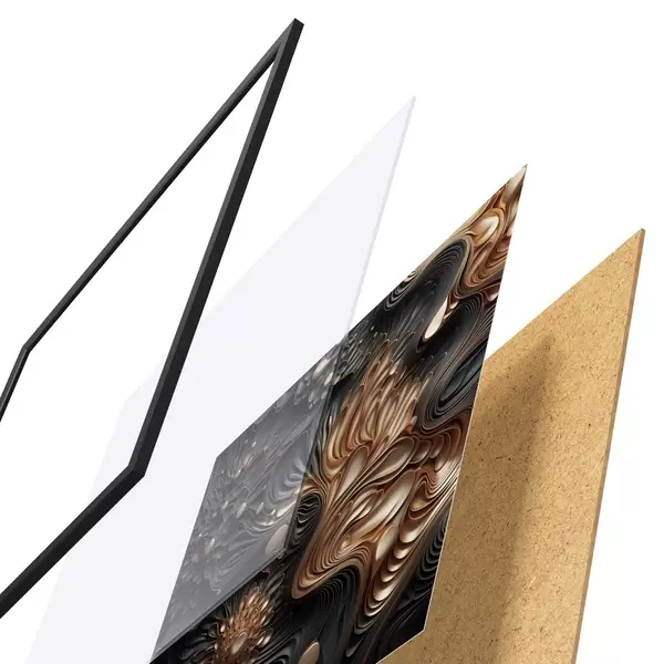 De poster bestaat uit een frame, plexiglas, geprinte afbeelding en spaanplaat achterkant. De poster kan meteen aan de muur worden gehangen dankzij de bevestigingen op de achterkant.