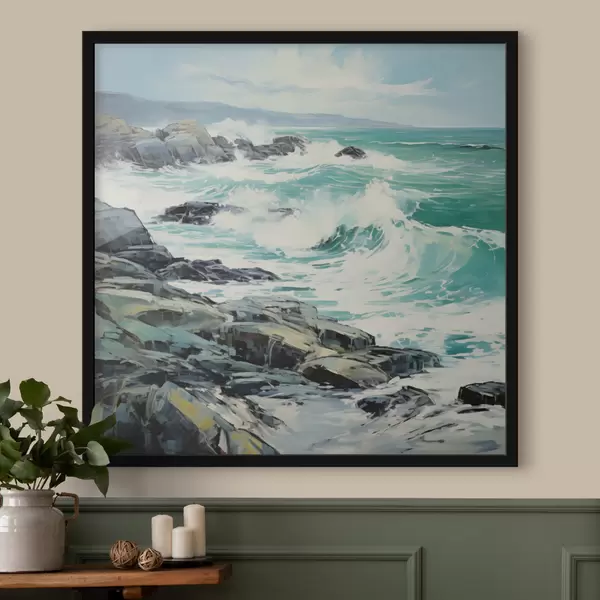 Poster Een rotsachtig kustlandschap met golven onder een bewolkte hemel, in schilderijstijl N° f48388