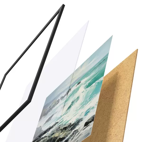 De poster bestaat uit een frame, plexiglas, geprinte afbeelding en spaanplaat achterkant. De poster kan meteen aan de muur worden gehangen dankzij de bevestigingen op de achterkant.
