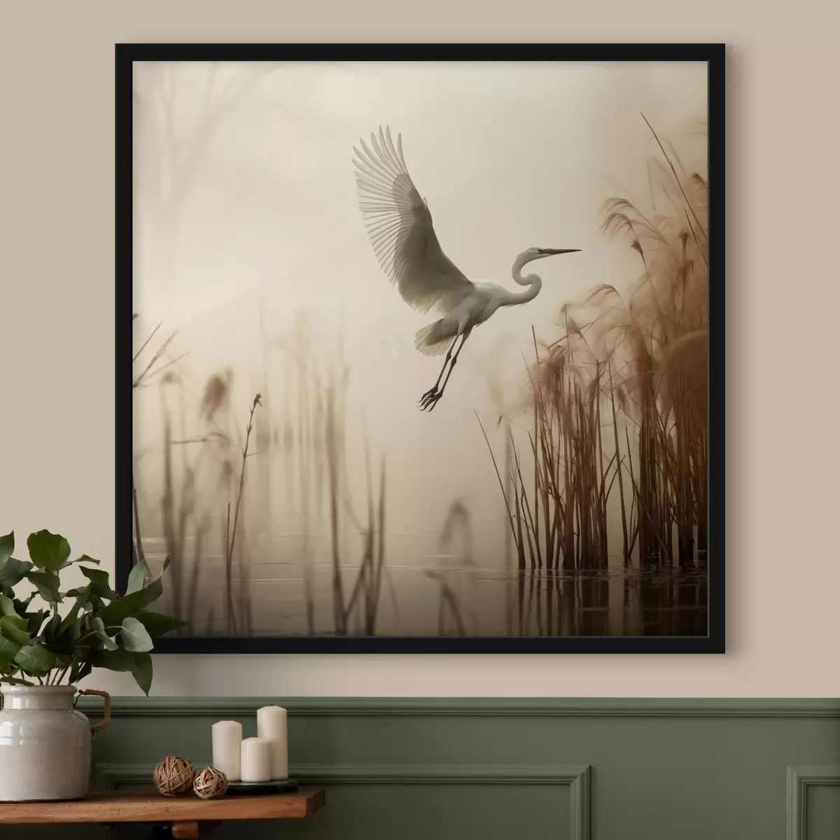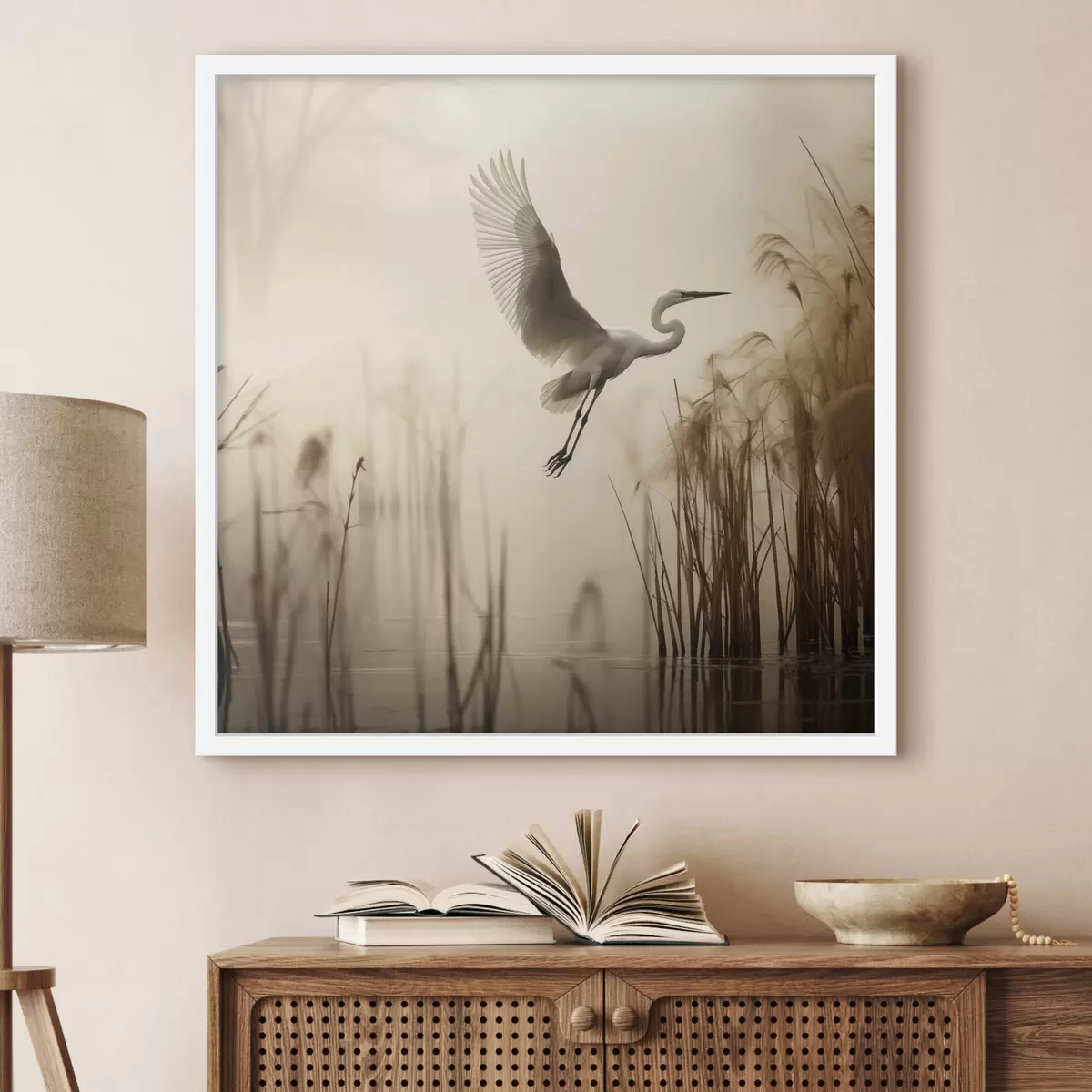 Poster Een witte reiger vliegt over een meer, omringd door hoog riet en bomen op de achtergrond N° f48389