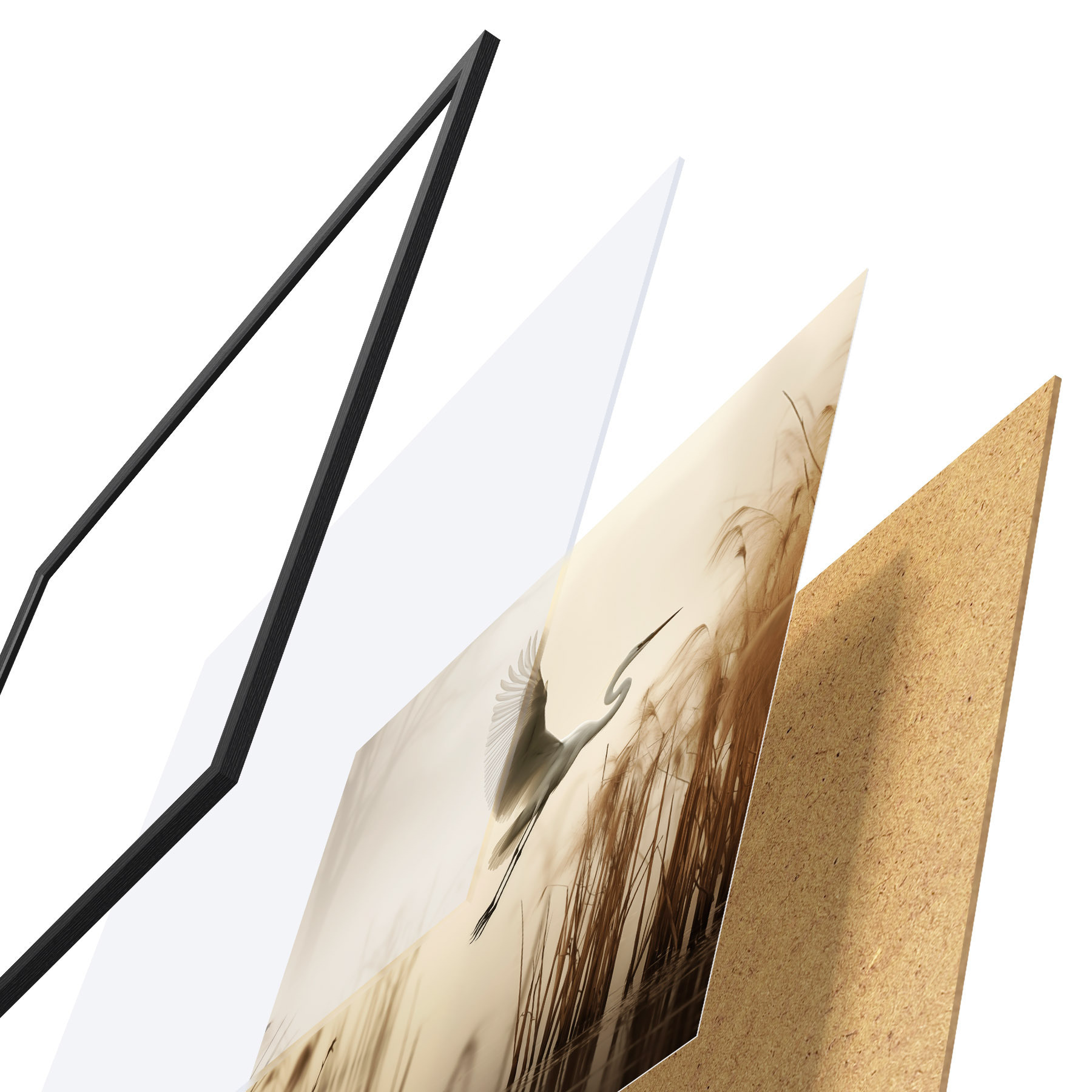 De poster bestaat uit een frame, plexiglas, geprinte afbeelding en spaanplaat achterkant. De poster kan meteen aan de muur worden gehangen dankzij de bevestigingen op de achterkant.