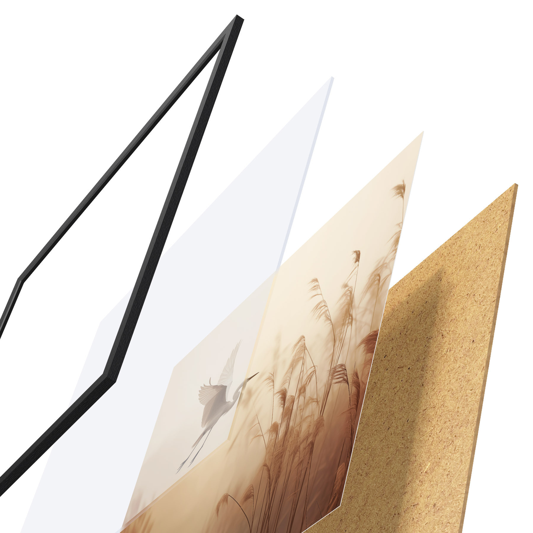 De poster bestaat uit een frame, plexiglas, geprinte afbeelding en spaanplaat achterkant. De poster kan meteen aan de muur worden gehangen dankzij de bevestigingen op de achterkant.