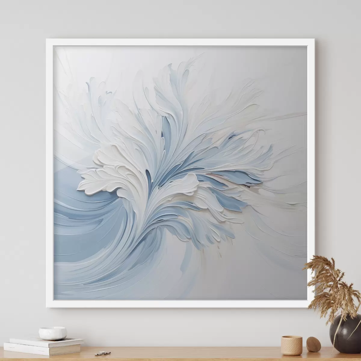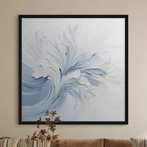 Poster Een abstract bloemmotief in wit en lichtblauw met bloemblaadjes met textuur en wervelende lijnen N° f48395