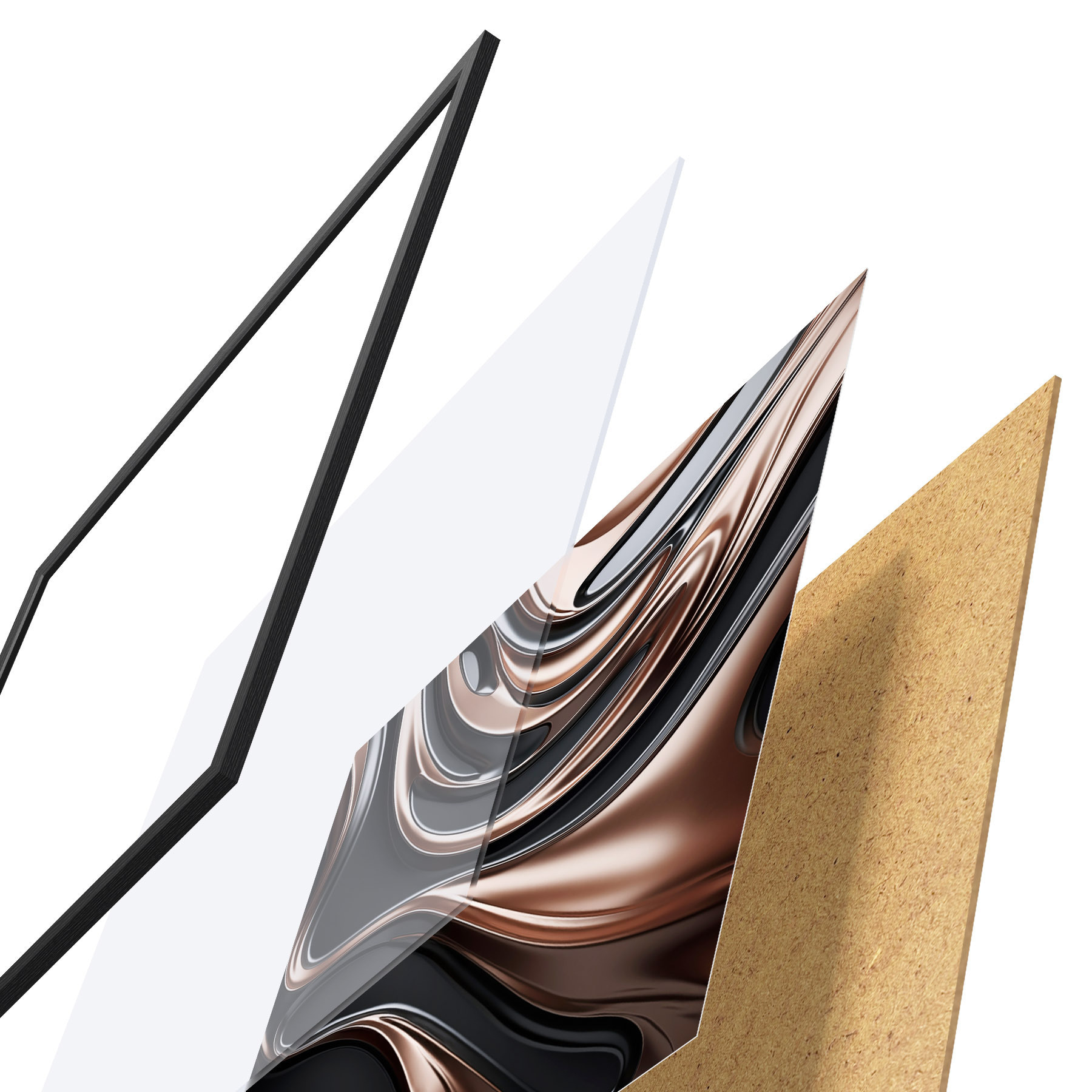 De poster bestaat uit een frame, plexiglas, geprinte afbeelding en spaanplaat achterkant. De poster kan meteen aan de muur worden gehangen dankzij de bevestigingen op de achterkant.