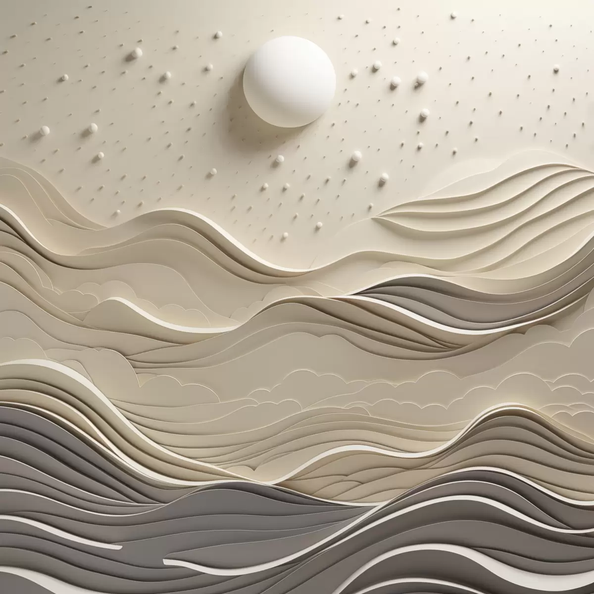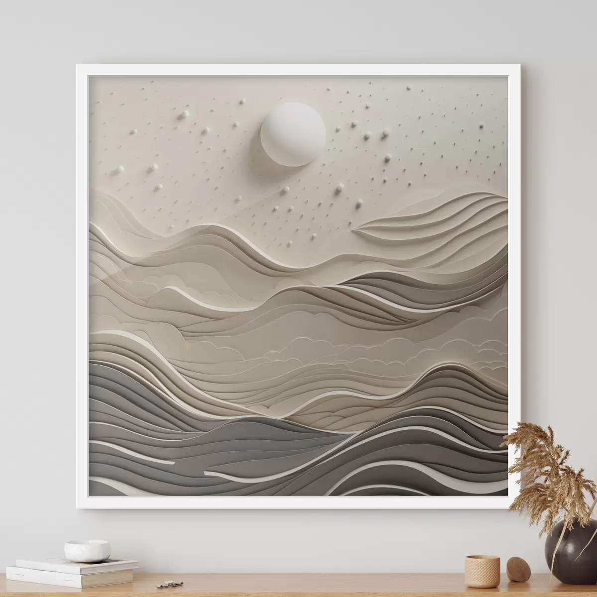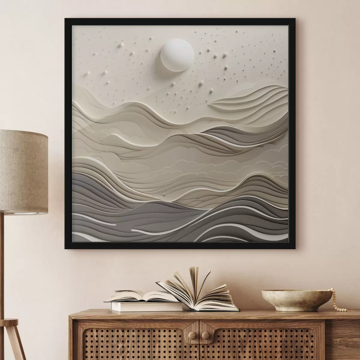 Poster Een minimalistisch, gestileerd landschap met glooiende heuvels en een grote maan aan een sterrenhemel, abstracte kunst N° f48402