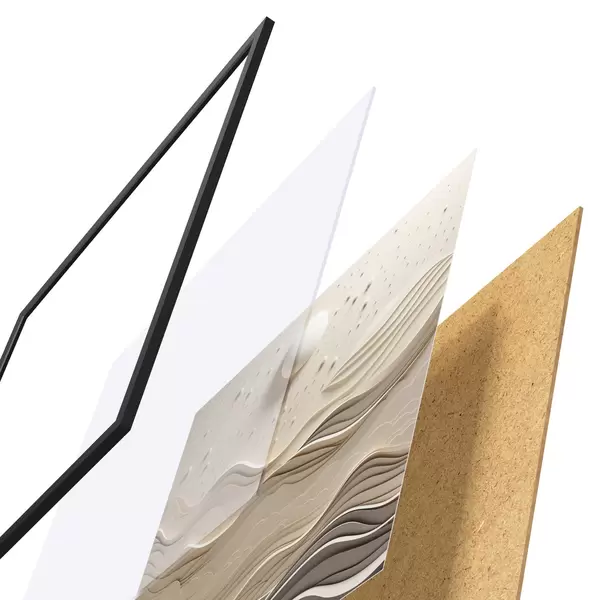 De poster bestaat uit een frame, plexiglas, geprinte afbeelding en spaanplaat achterkant. De poster kan meteen aan de muur worden gehangen dankzij de bevestigingen op de achterkant.