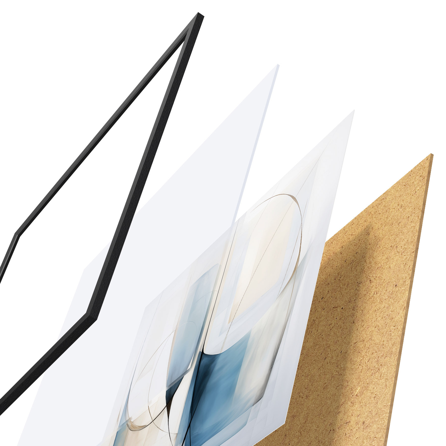 De poster bestaat uit een frame, plexiglas, geprinte afbeelding en spaanplaat achterkant. De poster kan meteen aan de muur worden gehangen dankzij de bevestigingen op de achterkant.