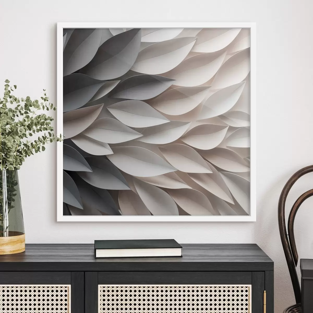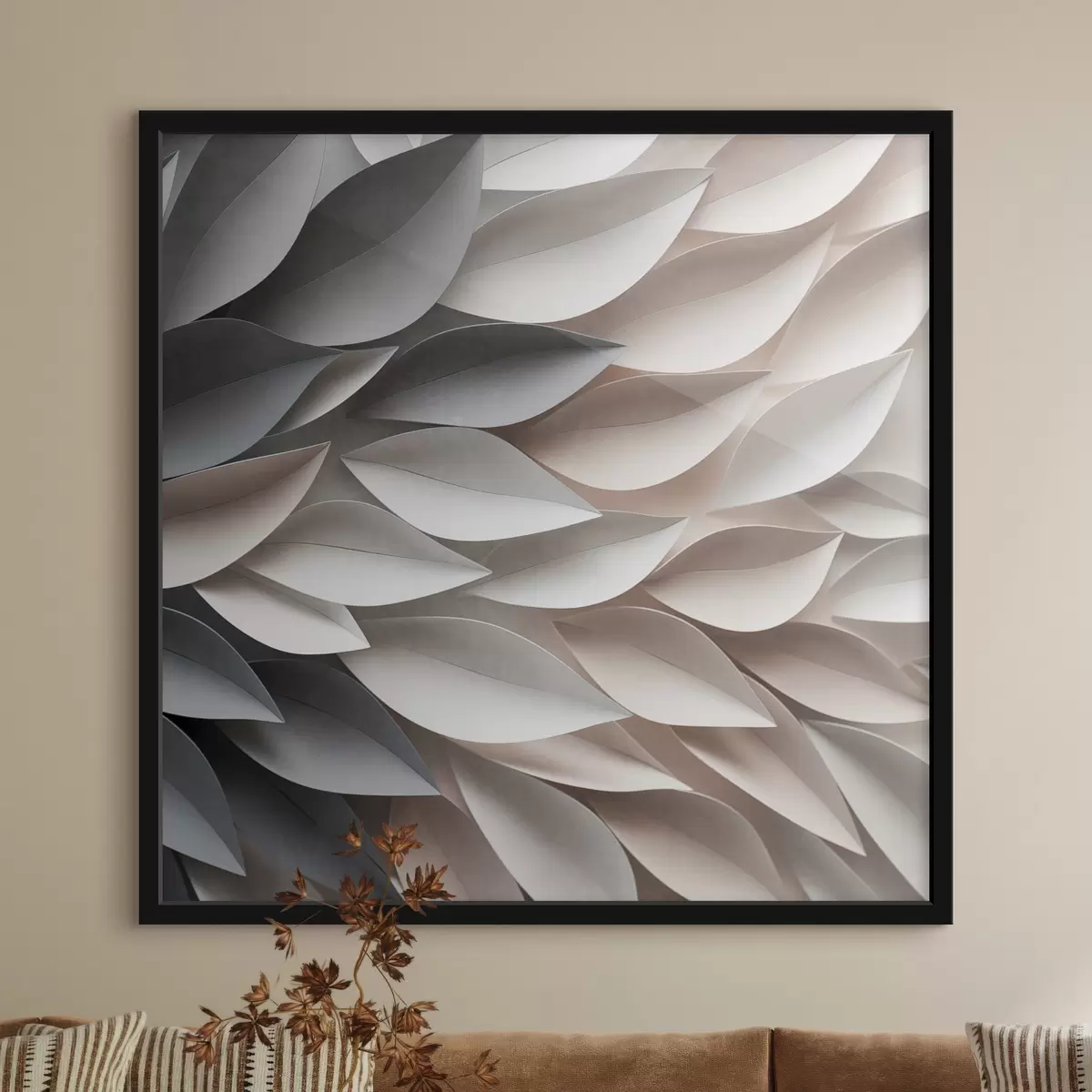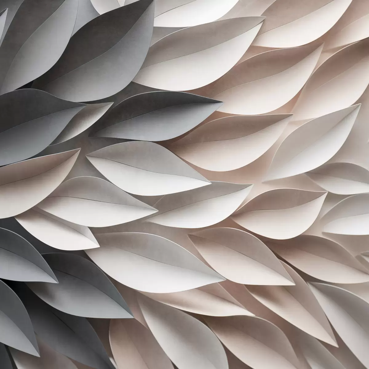 Poster Een gestructureerd patroon van overlappende abstracte bladvormen in neutrale tinten van beige, crème en grijs N° f48408
