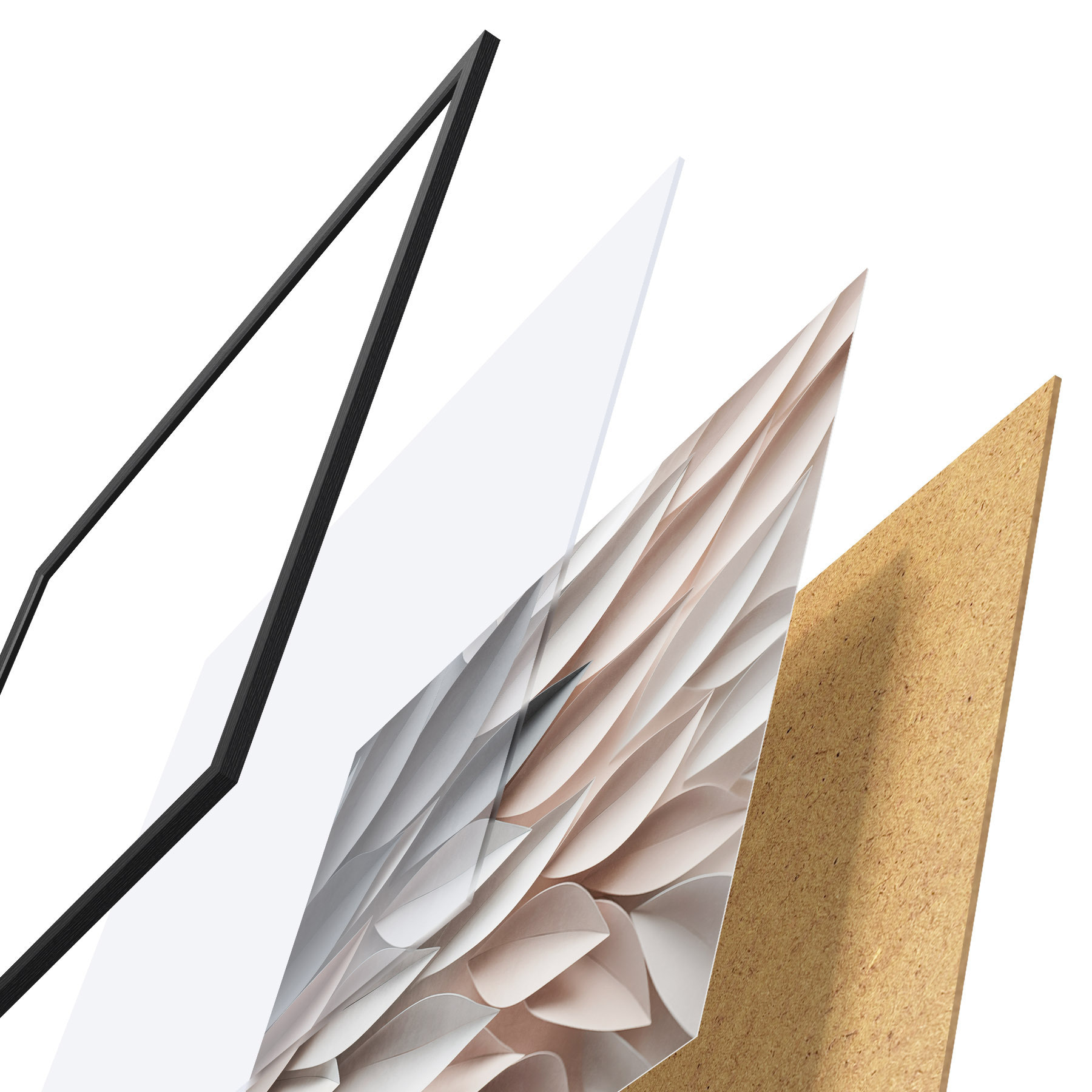 De poster bestaat uit een frame, plexiglas, geprinte afbeelding en spaanplaat achterkant. De poster kan meteen aan de muur worden gehangen dankzij de bevestigingen op de achterkant.
