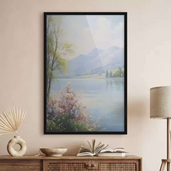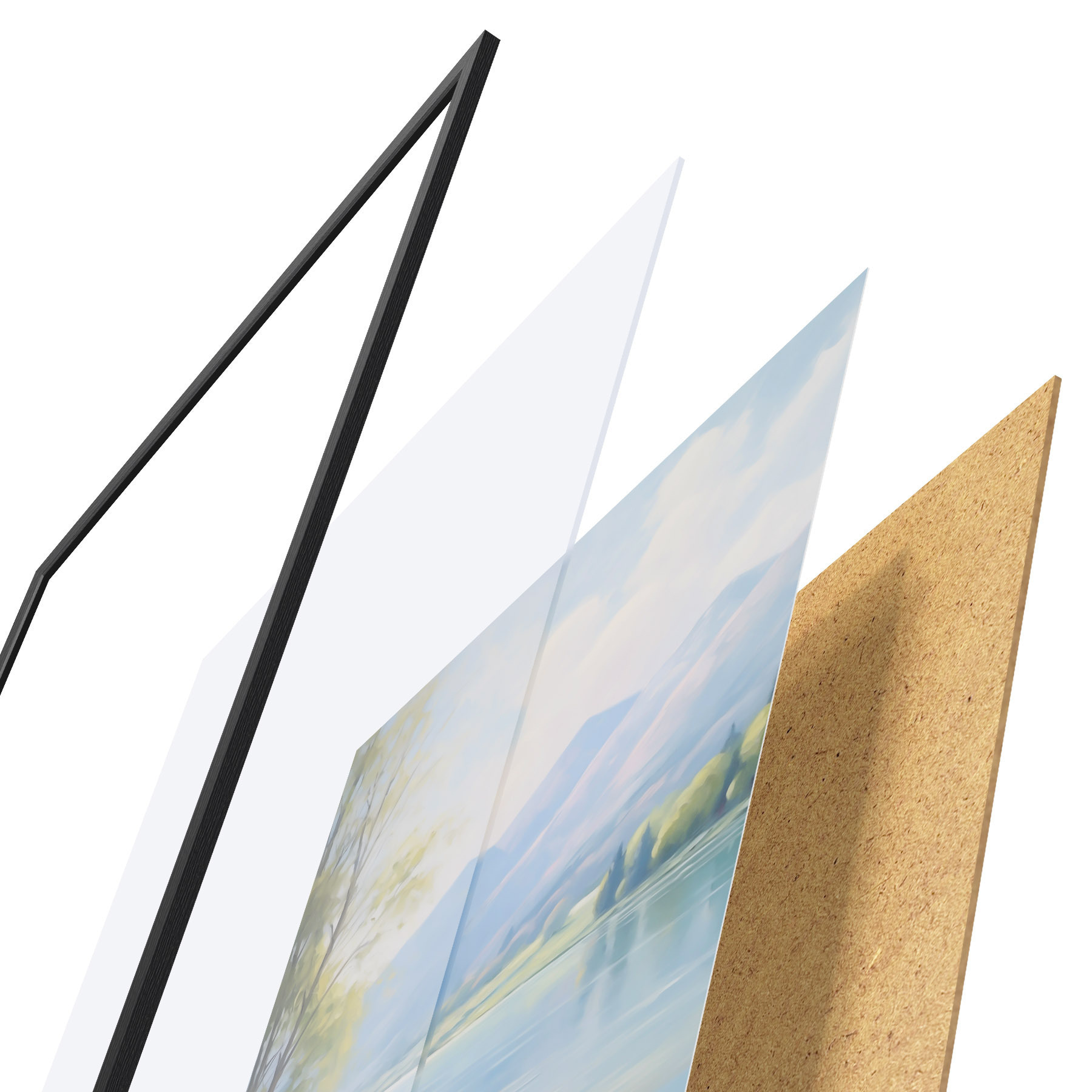 De poster bestaat uit een frame, plexiglas, geprinte afbeelding en spaanplaat achterkant. De poster kan meteen aan de muur worden gehangen dankzij de bevestigingen op de achterkant.