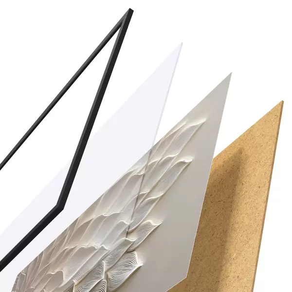 De poster bestaat uit een frame, plexiglas, geprinte afbeelding en spaanplaat achterkant. De poster kan meteen aan de muur worden gehangen dankzij de bevestigingen op de achterkant.