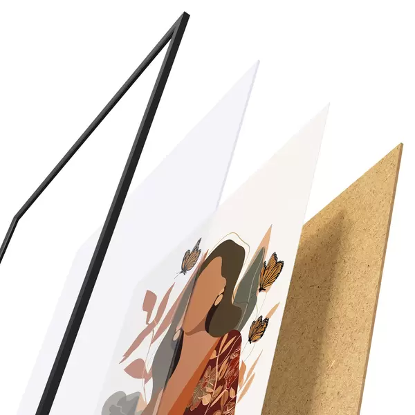 De poster bestaat uit een frame, plexiglas, geprinte afbeelding en spaanplaat achterkant. De poster kan meteen aan de muur worden gehangen dankzij de bevestigingen op de achterkant.
