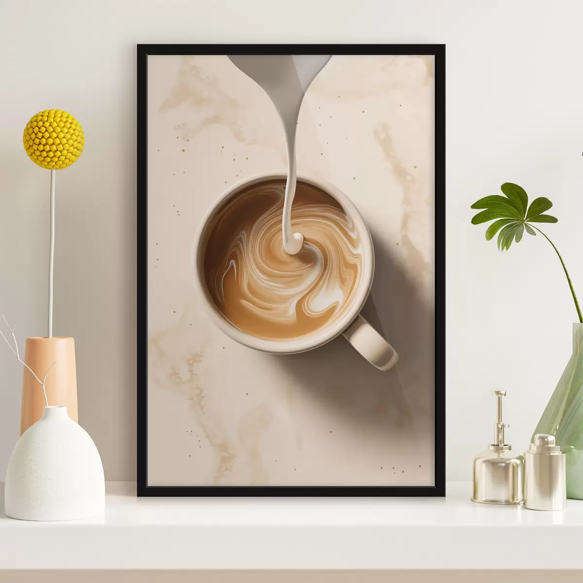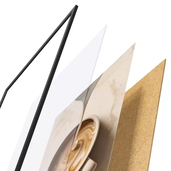 De poster bestaat uit een frame, plexiglas, geprinte afbeelding en spaanplaat achterkant. De poster kan meteen aan de muur worden gehangen dankzij de bevestigingen op de achterkant.