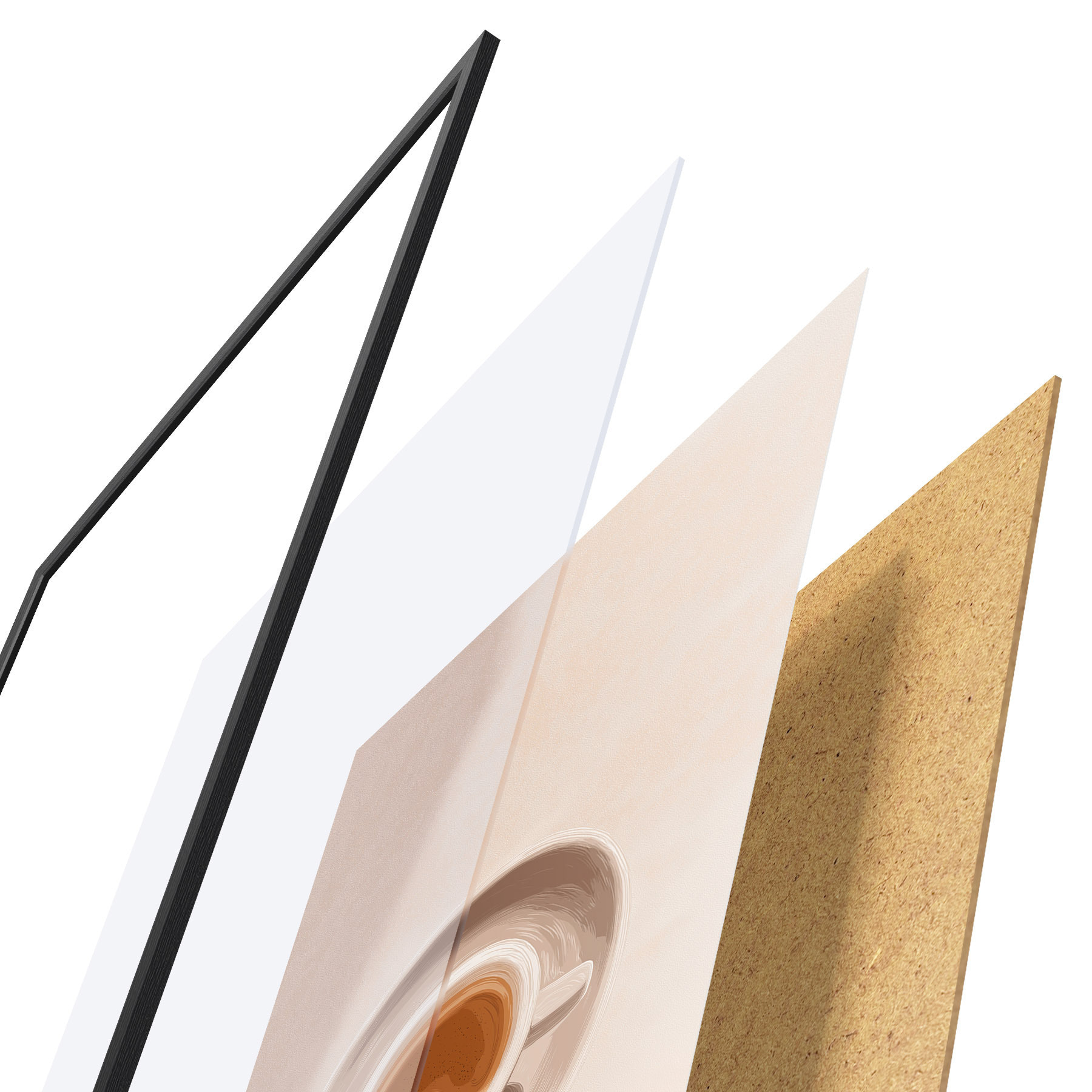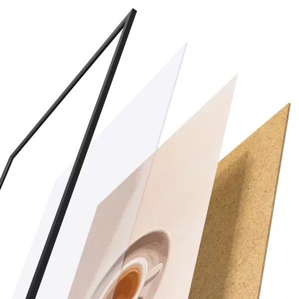 De poster bestaat uit een frame, plexiglas, geprinte afbeelding en spaanplaat achterkant. De poster kan meteen aan de muur worden gehangen dankzij de bevestigingen op de achterkant.
