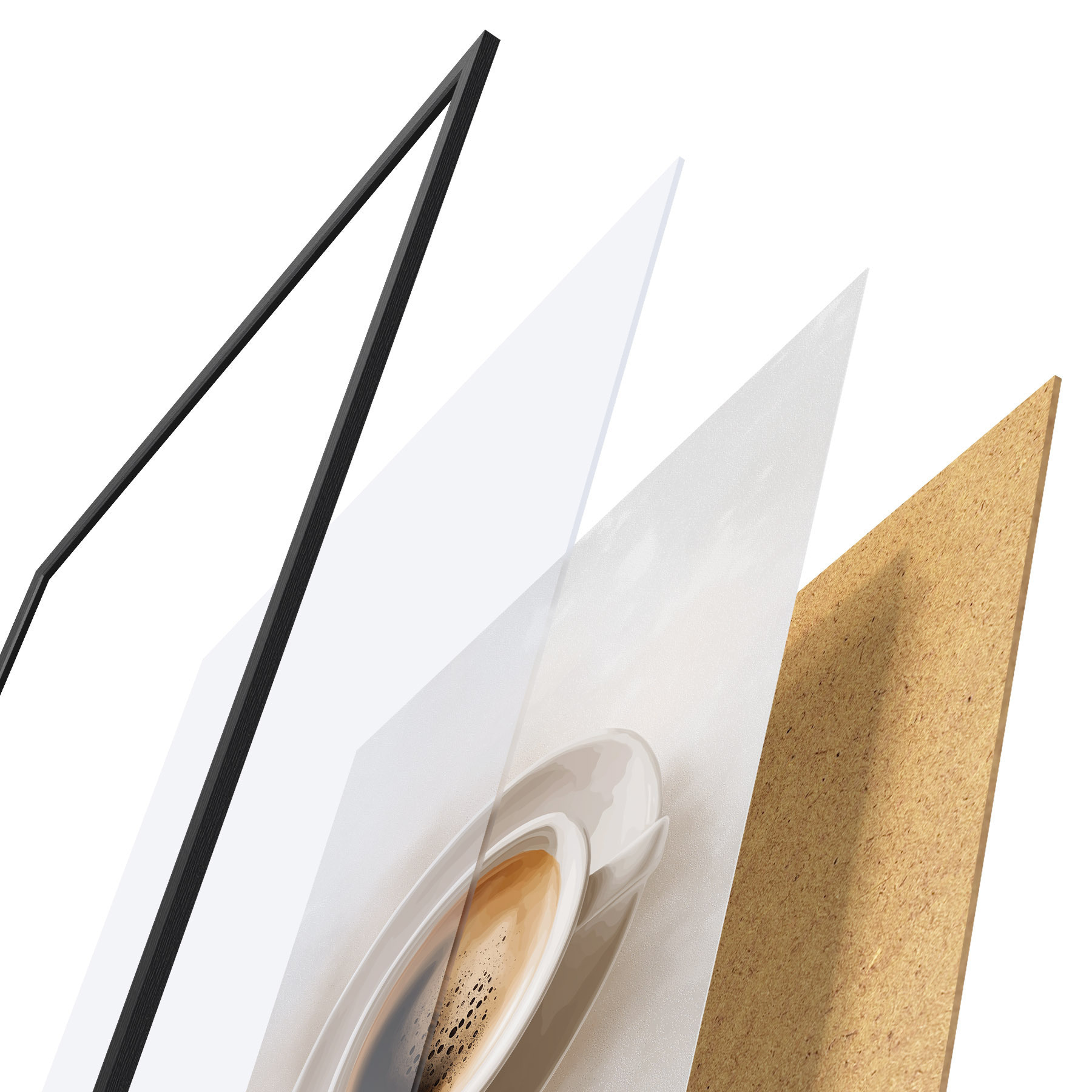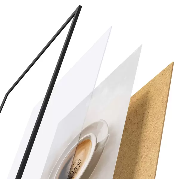 De poster bestaat uit een frame, plexiglas, geprinte afbeelding en spaanplaat achterkant. De poster kan meteen aan de muur worden gehangen dankzij de bevestigingen op de achterkant.