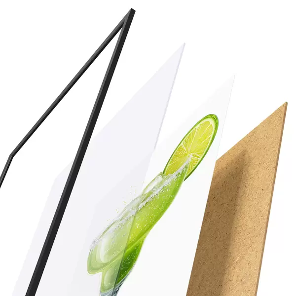 De poster bestaat uit een frame, plexiglas, geprinte afbeelding en spaanplaat achterkant. De poster kan meteen aan de muur worden gehangen dankzij de bevestigingen op de achterkant.