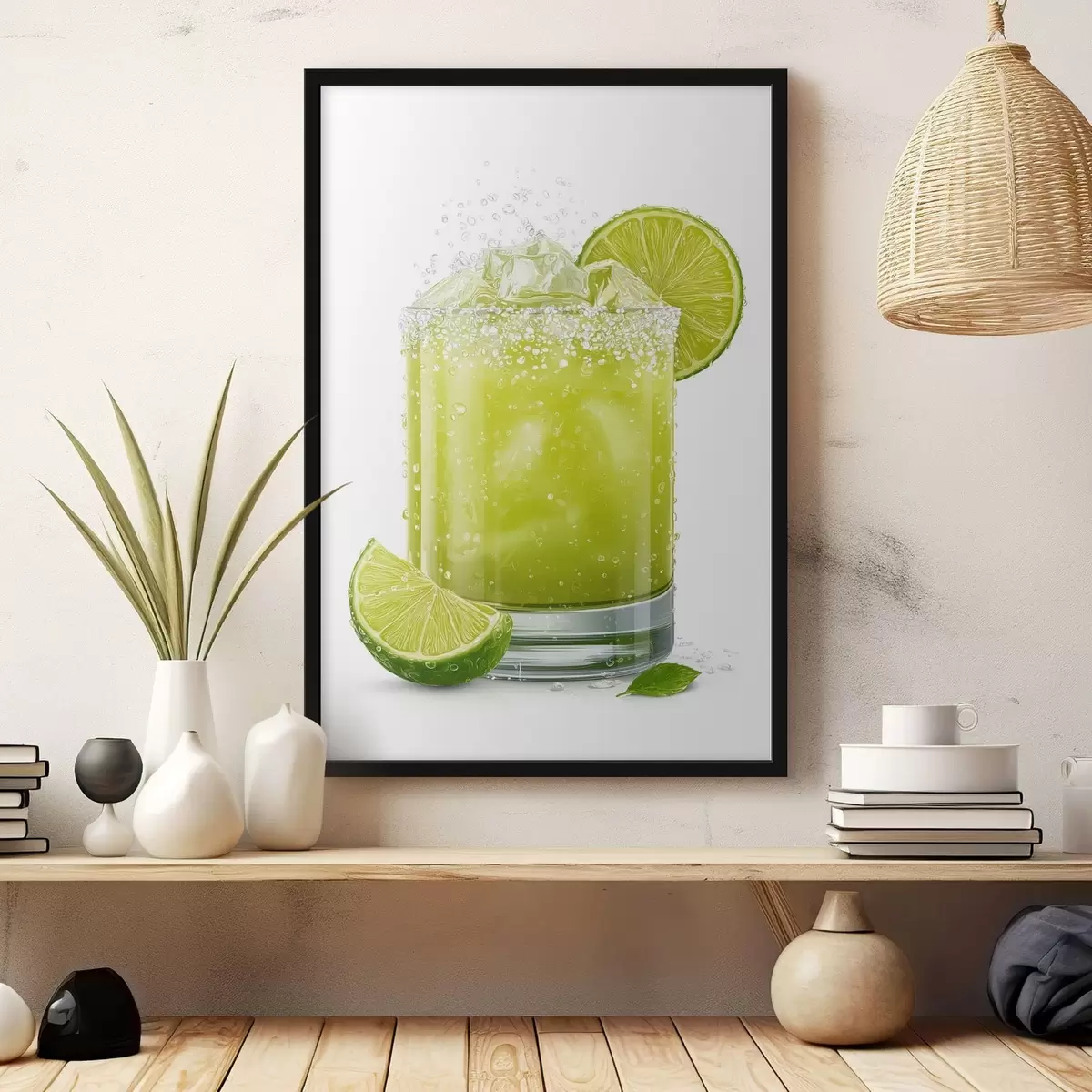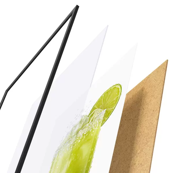 De poster bestaat uit een frame, plexiglas, geprinte afbeelding en spaanplaat achterkant. De poster kan meteen aan de muur worden gehangen dankzij de bevestigingen op de achterkant.