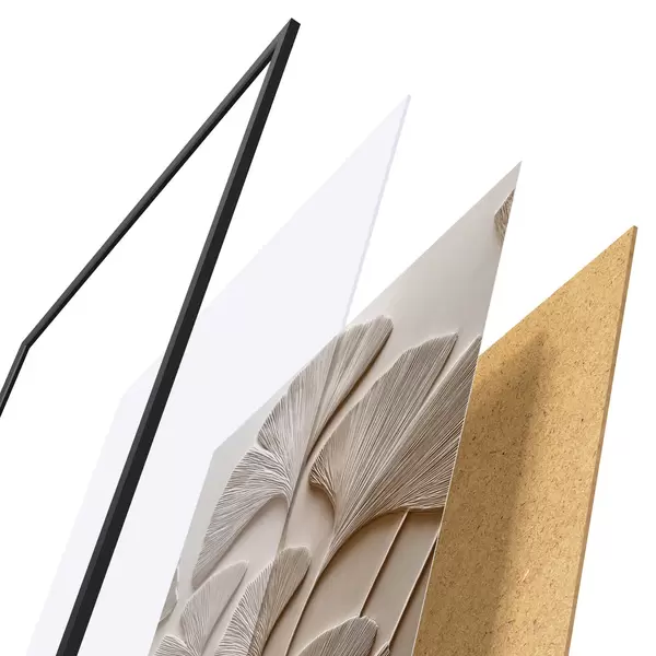 De poster bestaat uit een frame, plexiglas, geprinte afbeelding en spaanplaat achterkant. De poster kan meteen aan de muur worden gehangen dankzij de bevestigingen op de achterkant.