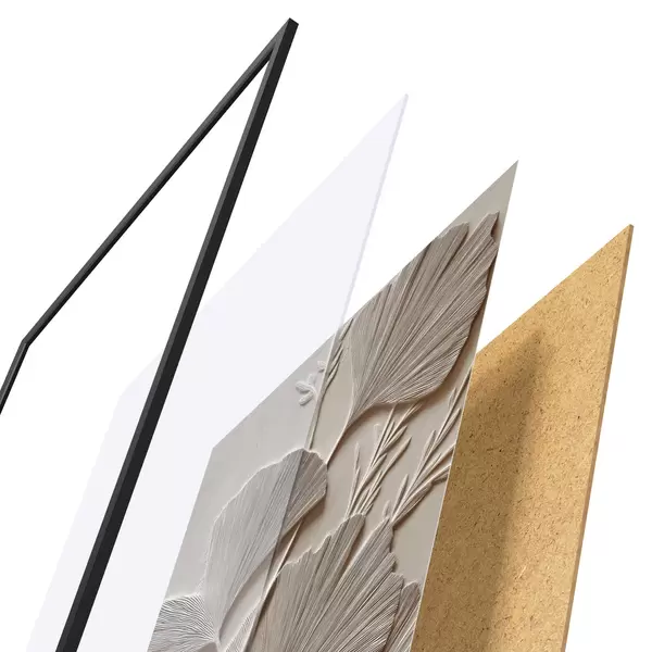 De poster bestaat uit een frame, plexiglas, geprinte afbeelding en spaanplaat achterkant. De poster kan meteen aan de muur worden gehangen dankzij de bevestigingen op de achterkant.