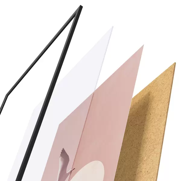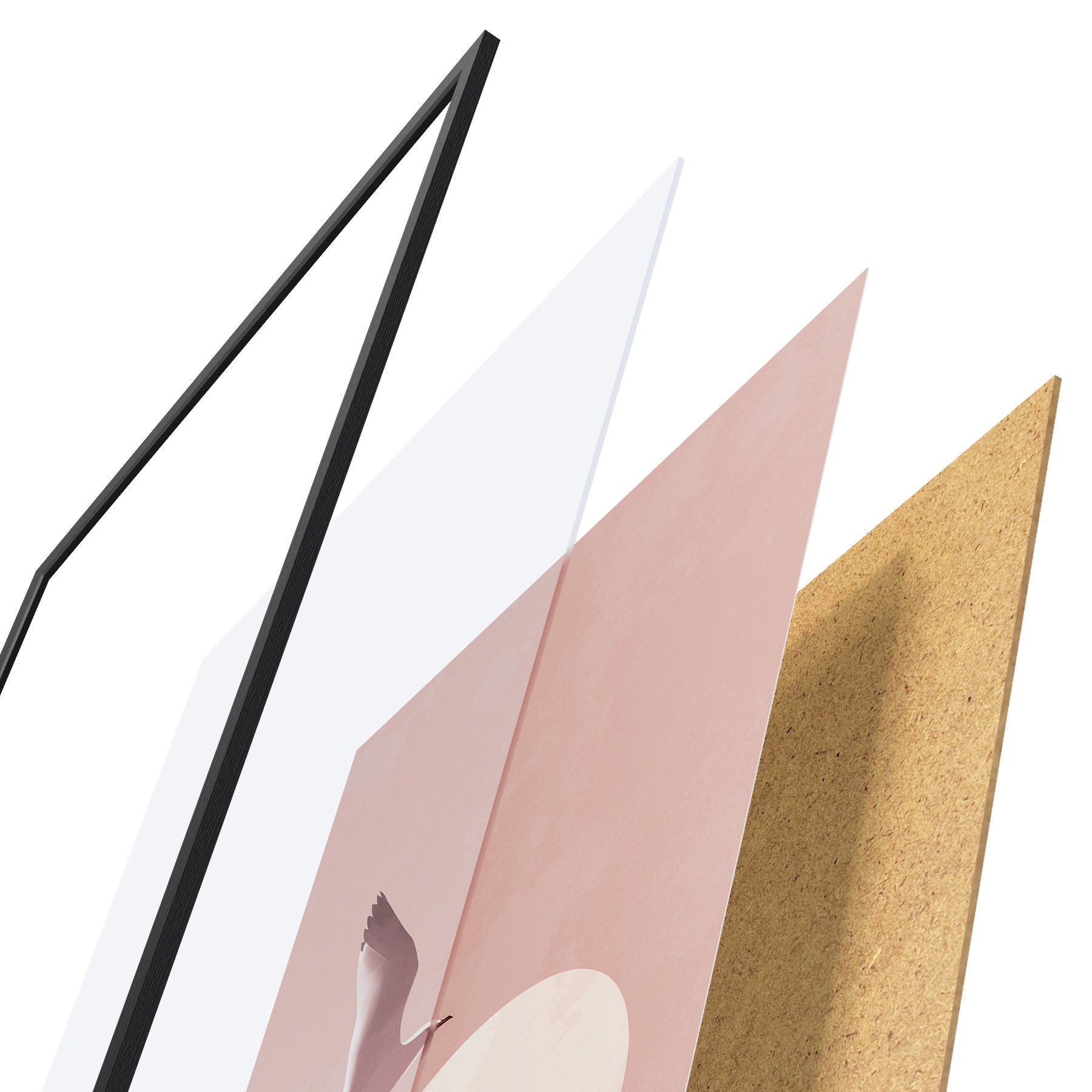 De poster bestaat uit een frame, plexiglas, geprinte afbeelding en spaanplaat achterkant. De poster kan meteen aan de muur worden gehangen dankzij de bevestigingen op de achterkant.