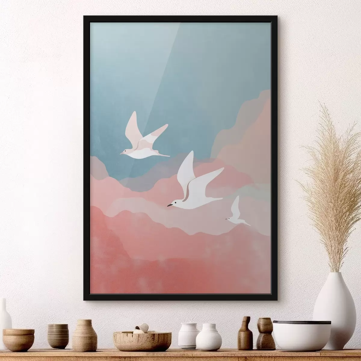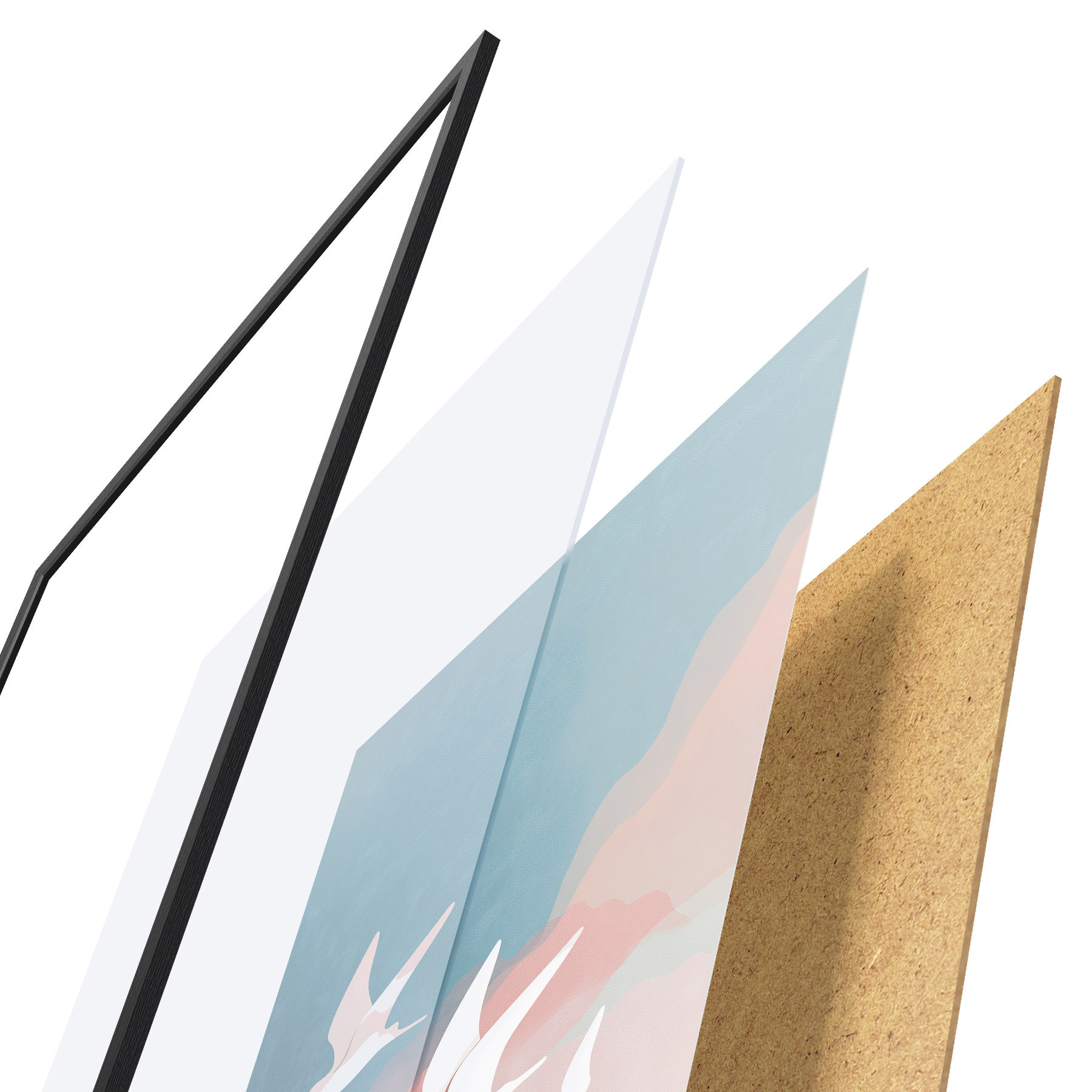 De poster bestaat uit een frame, plexiglas, geprinte afbeelding en spaanplaat achterkant. De poster kan meteen aan de muur worden gehangen dankzij de bevestigingen op de achterkant.