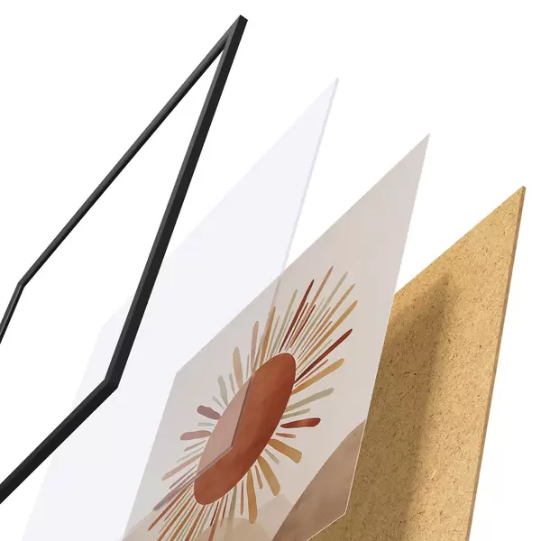 De poster bestaat uit een frame, plexiglas, geprinte afbeelding en spaanplaat achterkant. De poster kan meteen aan de muur worden gehangen dankzij de bevestigingen op de achterkant.