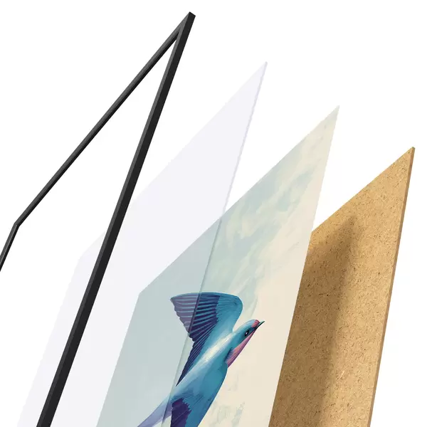 De poster bestaat uit een frame, plexiglas, geprinte afbeelding en spaanplaat achterkant. De poster kan meteen aan de muur worden gehangen dankzij de bevestigingen op de achterkant.