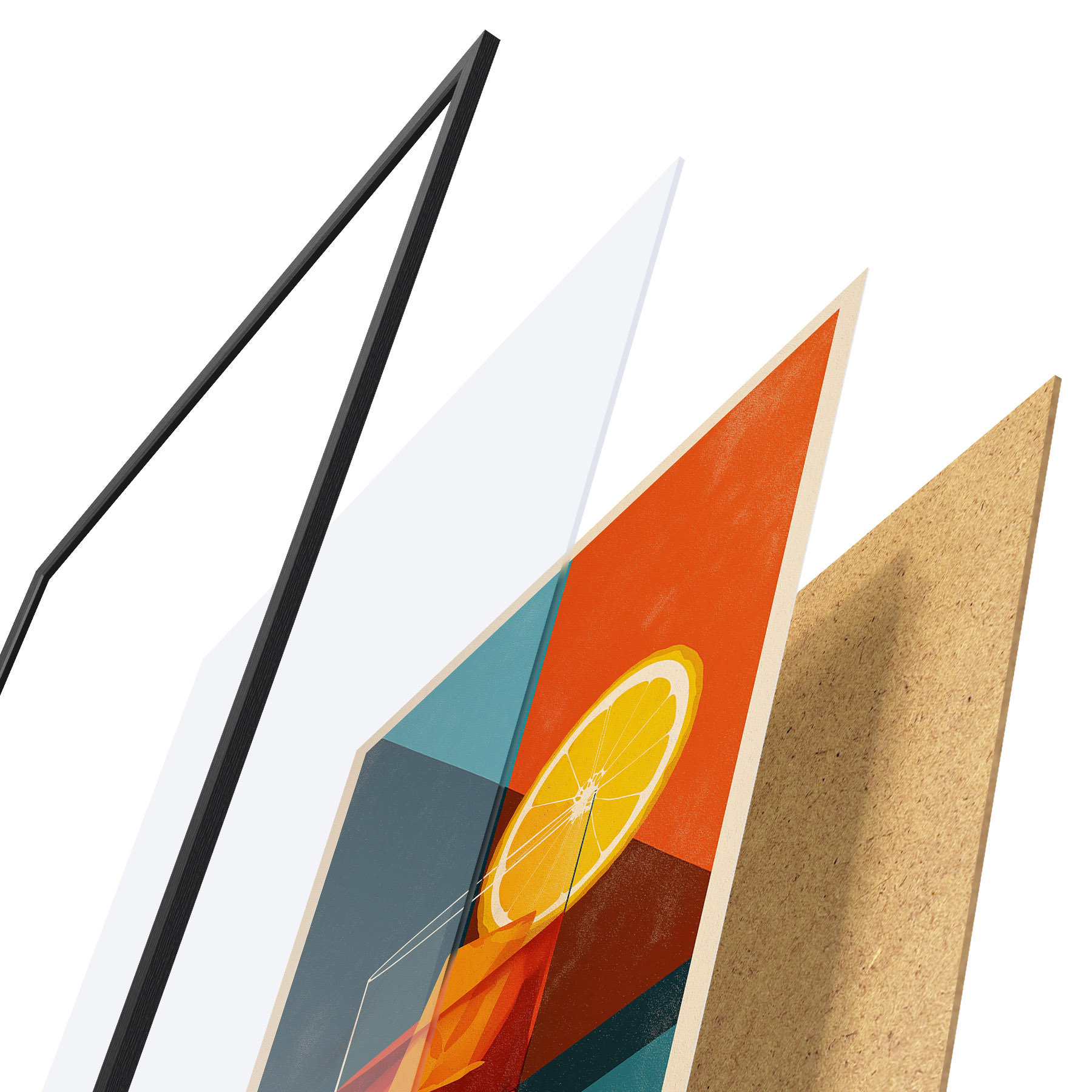De poster bestaat uit een frame, plexiglas, geprinte afbeelding en spaanplaat achterkant. De poster kan meteen aan de muur worden gehangen dankzij de bevestigingen op de achterkant.
