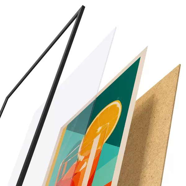De poster bestaat uit een frame, plexiglas, geprinte afbeelding en spaanplaat achterkant. De poster kan meteen aan de muur worden gehangen dankzij de bevestigingen op de achterkant.