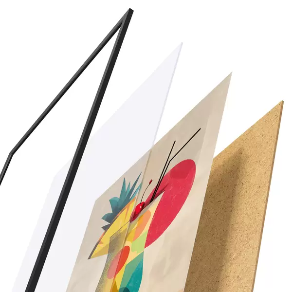 De poster bestaat uit een frame, plexiglas, geprinte afbeelding en spaanplaat achterkant. De poster kan meteen aan de muur worden gehangen dankzij de bevestigingen op de achterkant.