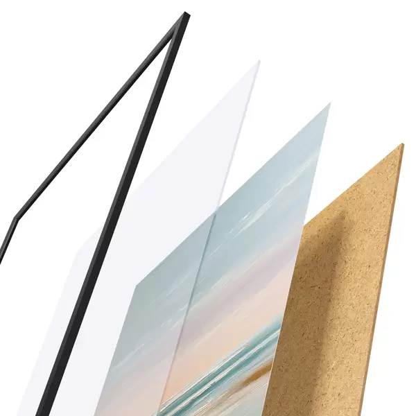 De poster bestaat uit een frame, plexiglas, geprinte afbeelding en spaanplaat achterkant. De poster kan meteen aan de muur worden gehangen dankzij de bevestigingen op de achterkant.