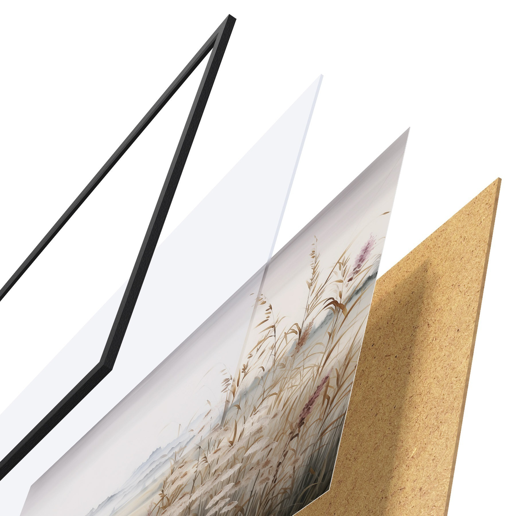 De poster bestaat uit een frame, plexiglas, geprinte afbeelding en spaanplaat achterkant. De poster kan meteen aan de muur worden gehangen dankzij de bevestigingen op de achterkant.