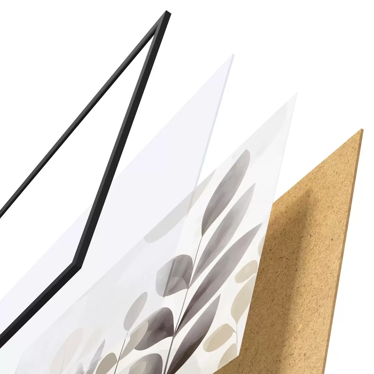 De poster bestaat uit een frame, plexiglas, geprinte afbeelding en spaanplaat achterkant. De poster kan meteen aan de muur worden gehangen dankzij de bevestigingen op de achterkant.