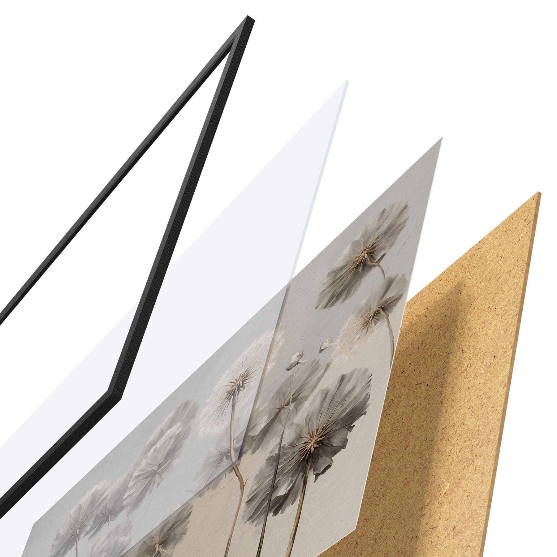 De poster bestaat uit een frame, plexiglas, geprinte afbeelding en spaanplaat achterkant. De poster kan meteen aan de muur worden gehangen dankzij de bevestigingen op de achterkant.