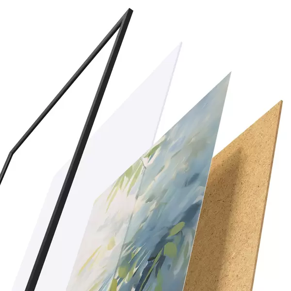 De poster bestaat uit een frame, plexiglas, geprinte afbeelding en spaanplaat achterkant. De poster kan meteen aan de muur worden gehangen dankzij de bevestigingen op de achterkant.