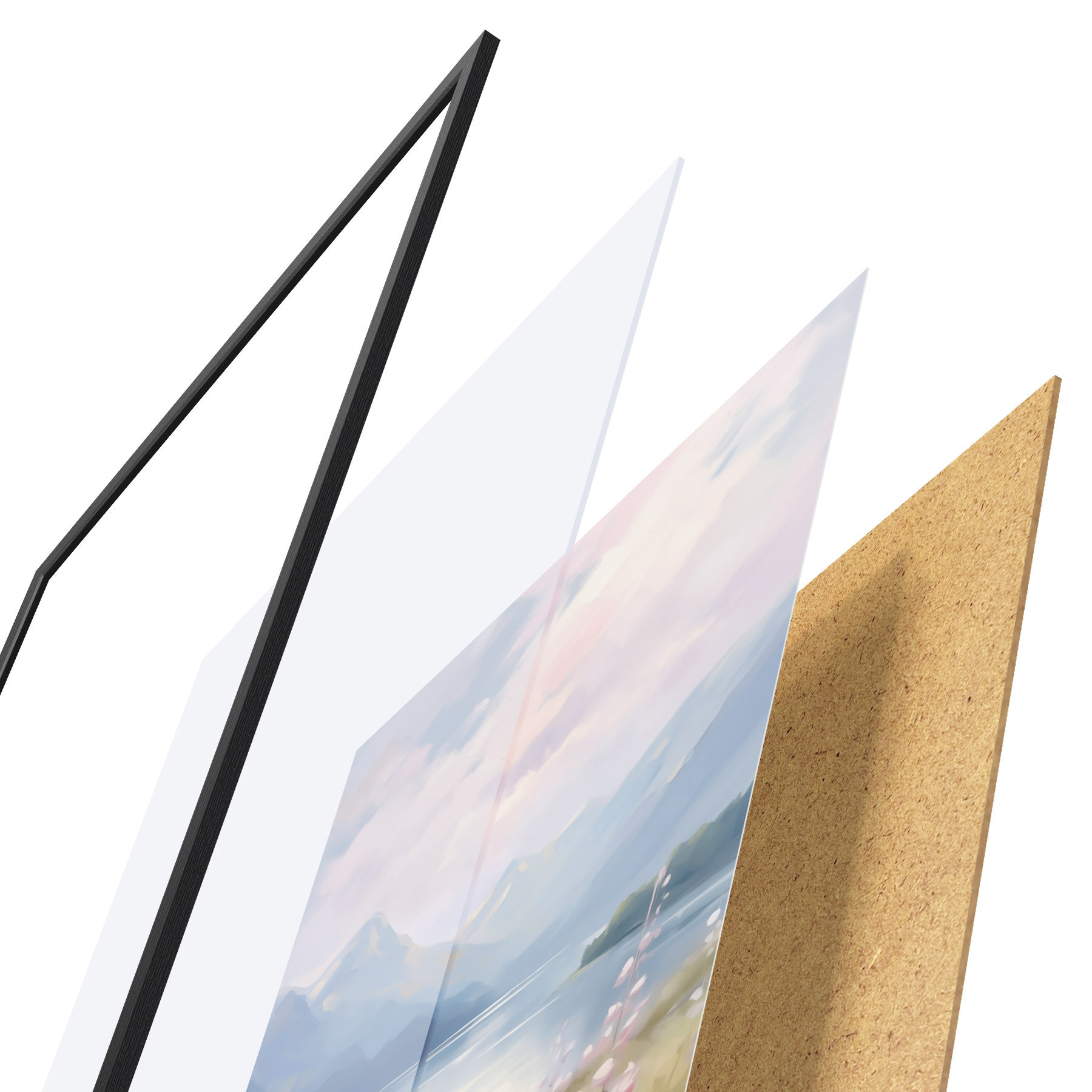 De poster bestaat uit een frame, plexiglas, geprinte afbeelding en spaanplaat achterkant. De poster kan meteen aan de muur worden gehangen dankzij de bevestigingen op de achterkant.