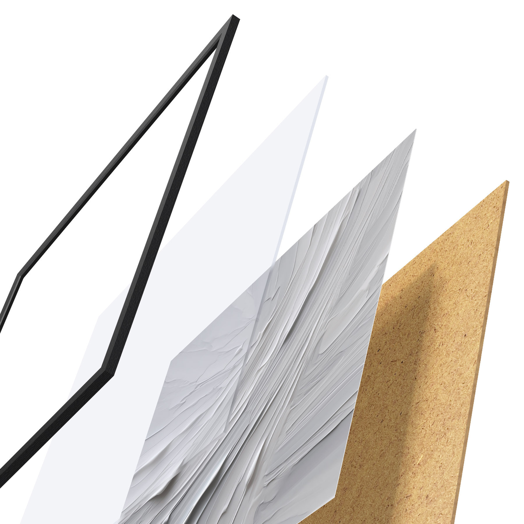 De poster bestaat uit een frame, plexiglas, geprinte afbeelding en spaanplaat achterkant. De poster kan meteen aan de muur worden gehangen dankzij de bevestigingen op de achterkant.