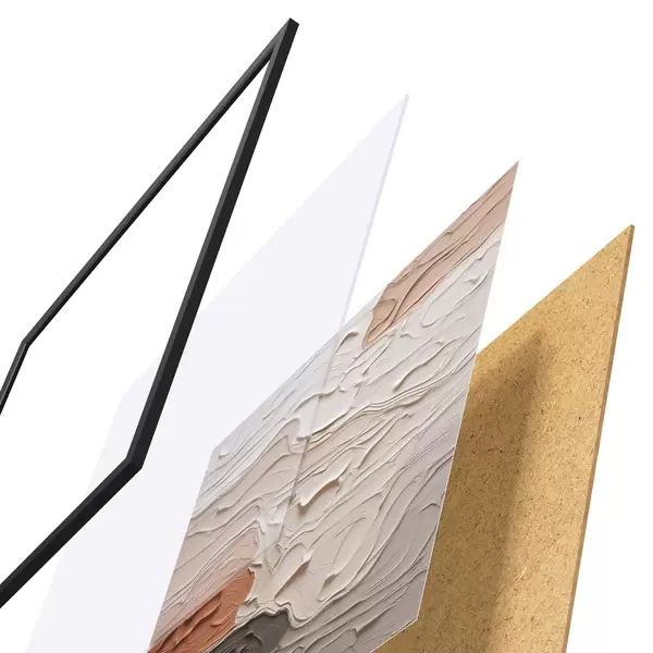 De poster bestaat uit een frame, plexiglas, geprinte afbeelding en spaanplaat achterkant. De poster kan meteen aan de muur worden gehangen dankzij de bevestigingen op de achterkant.