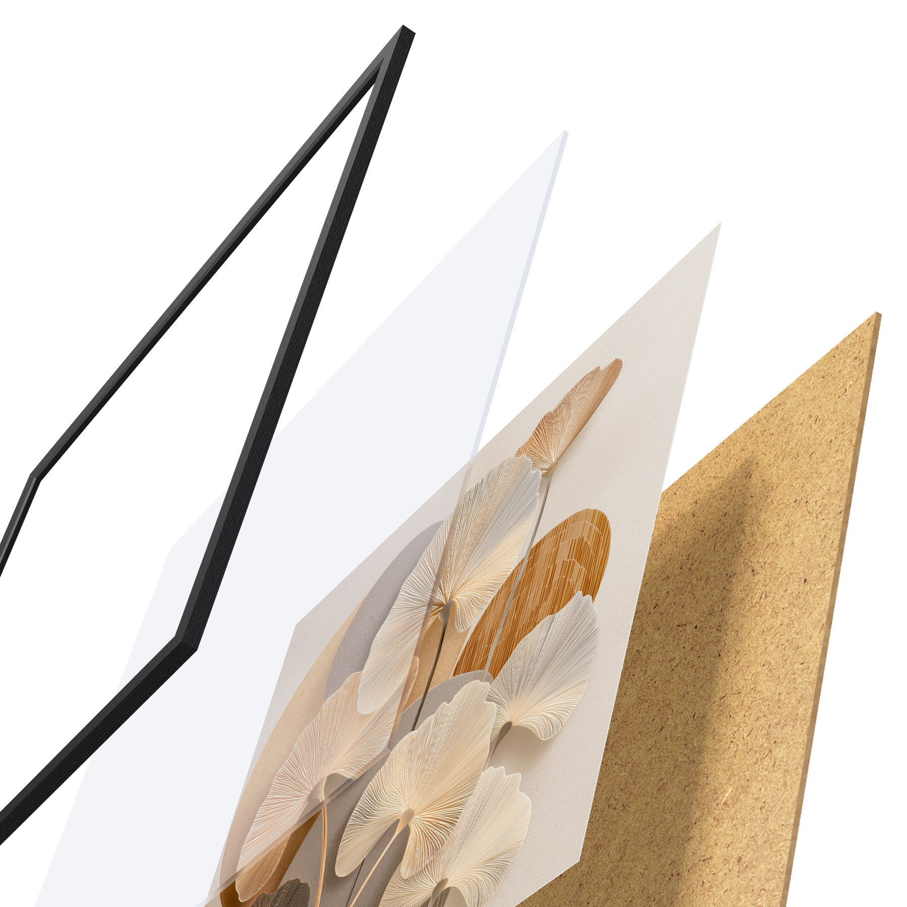 De poster bestaat uit een frame, plexiglas, geprinte afbeelding en spaanplaat achterkant. De poster kan meteen aan de muur worden gehangen dankzij de bevestigingen op de achterkant.