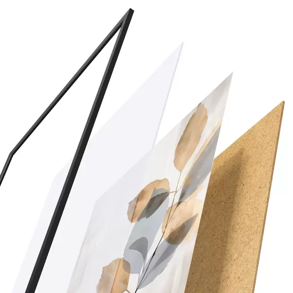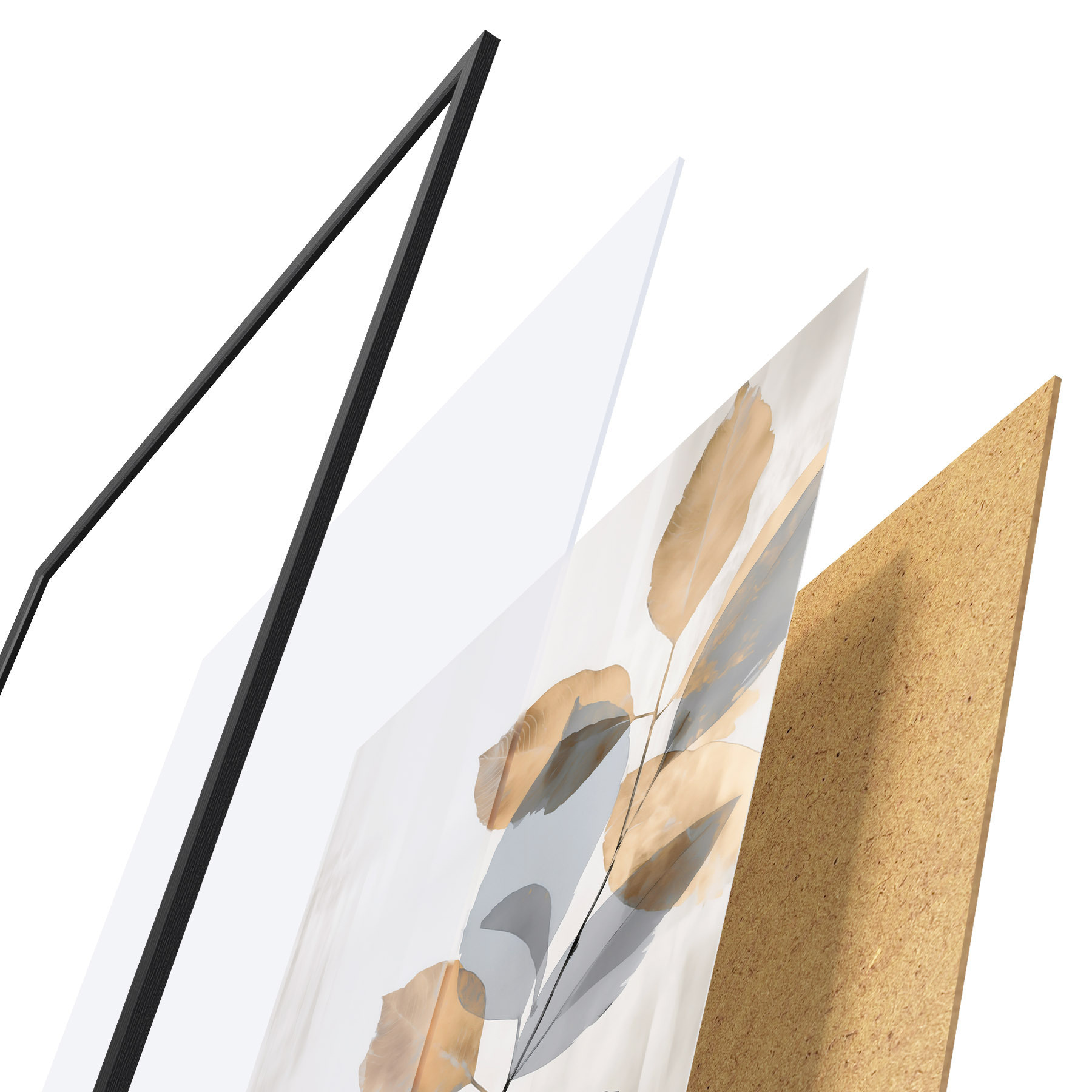 De poster bestaat uit een frame, plexiglas, geprinte afbeelding en spaanplaat achterkant. De poster kan meteen aan de muur worden gehangen dankzij de bevestigingen op de achterkant.