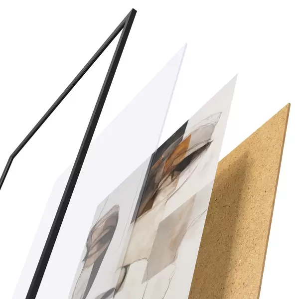 De poster bestaat uit een frame, plexiglas, geprinte afbeelding en spaanplaat achterkant. De poster kan meteen aan de muur worden gehangen dankzij de bevestigingen op de achterkant.