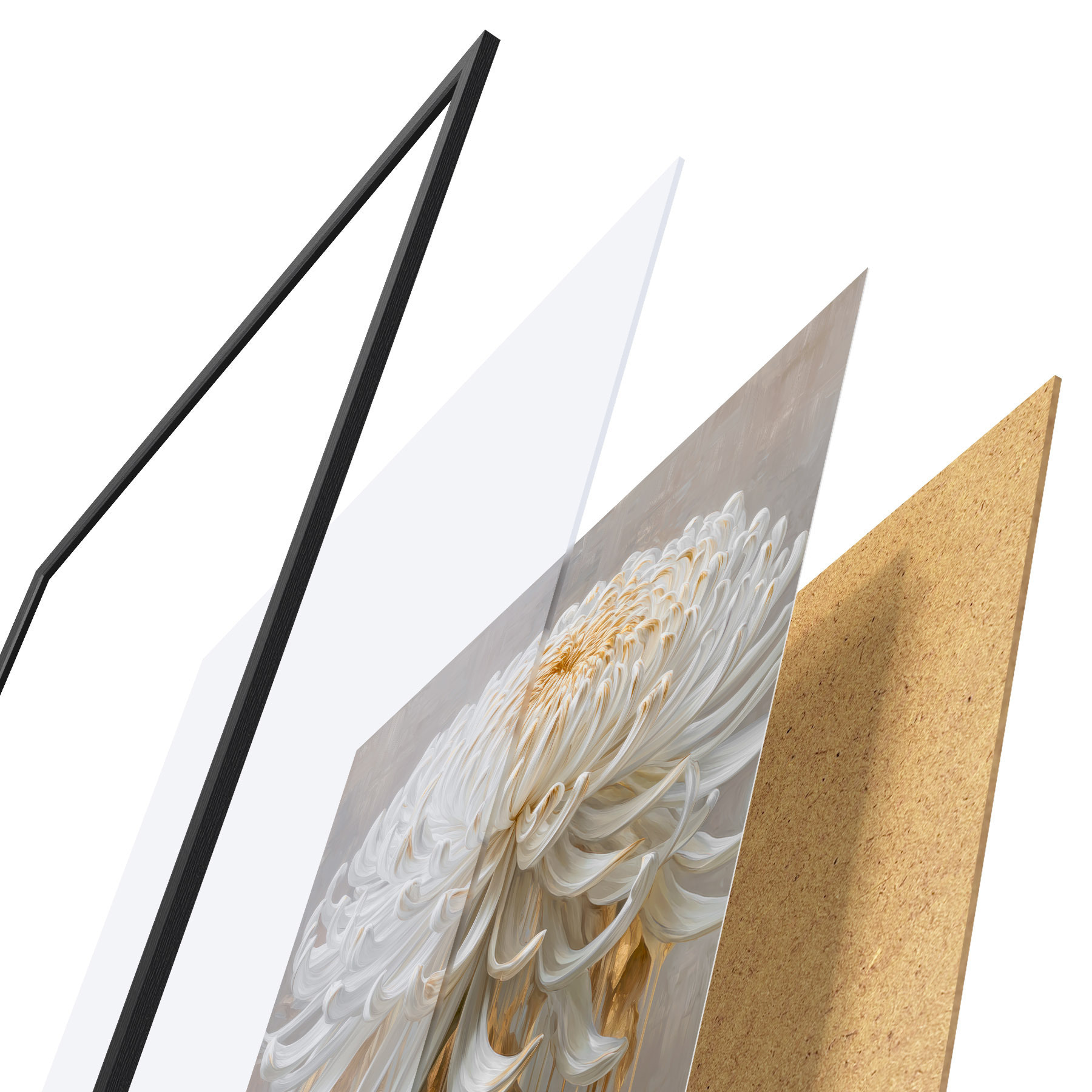 De poster bestaat uit een frame, plexiglas, geprinte afbeelding en spaanplaat achterkant. De poster kan meteen aan de muur worden gehangen dankzij de bevestigingen op de achterkant.