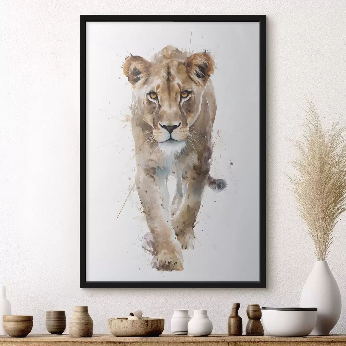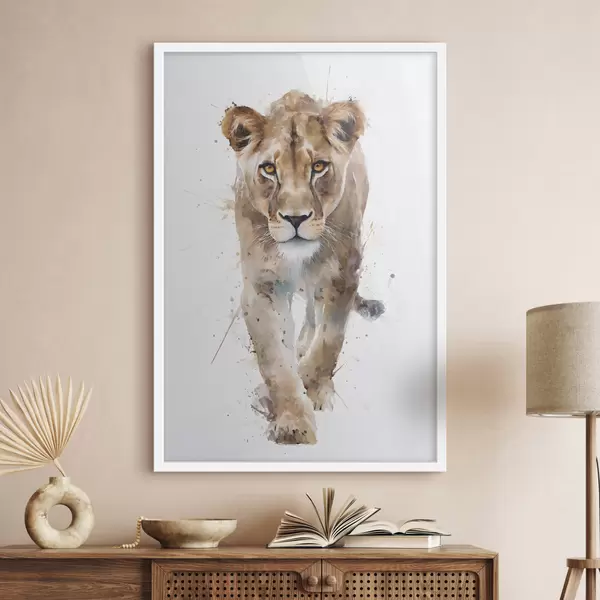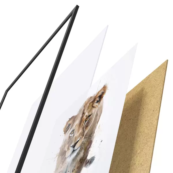 De poster bestaat uit een frame, plexiglas, geprinte afbeelding en spaanplaat achterkant. De poster kan meteen aan de muur worden gehangen dankzij de bevestigingen op de achterkant.