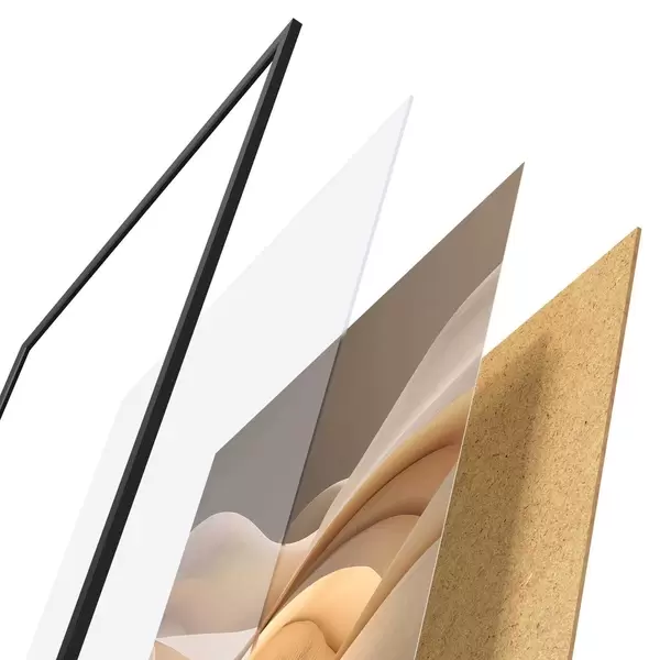De poster bestaat uit een frame, plexiglas, geprinte afbeelding en spaanplaat achterkant. De poster kan meteen aan de muur worden gehangen dankzij de bevestigingen op de achterkant.