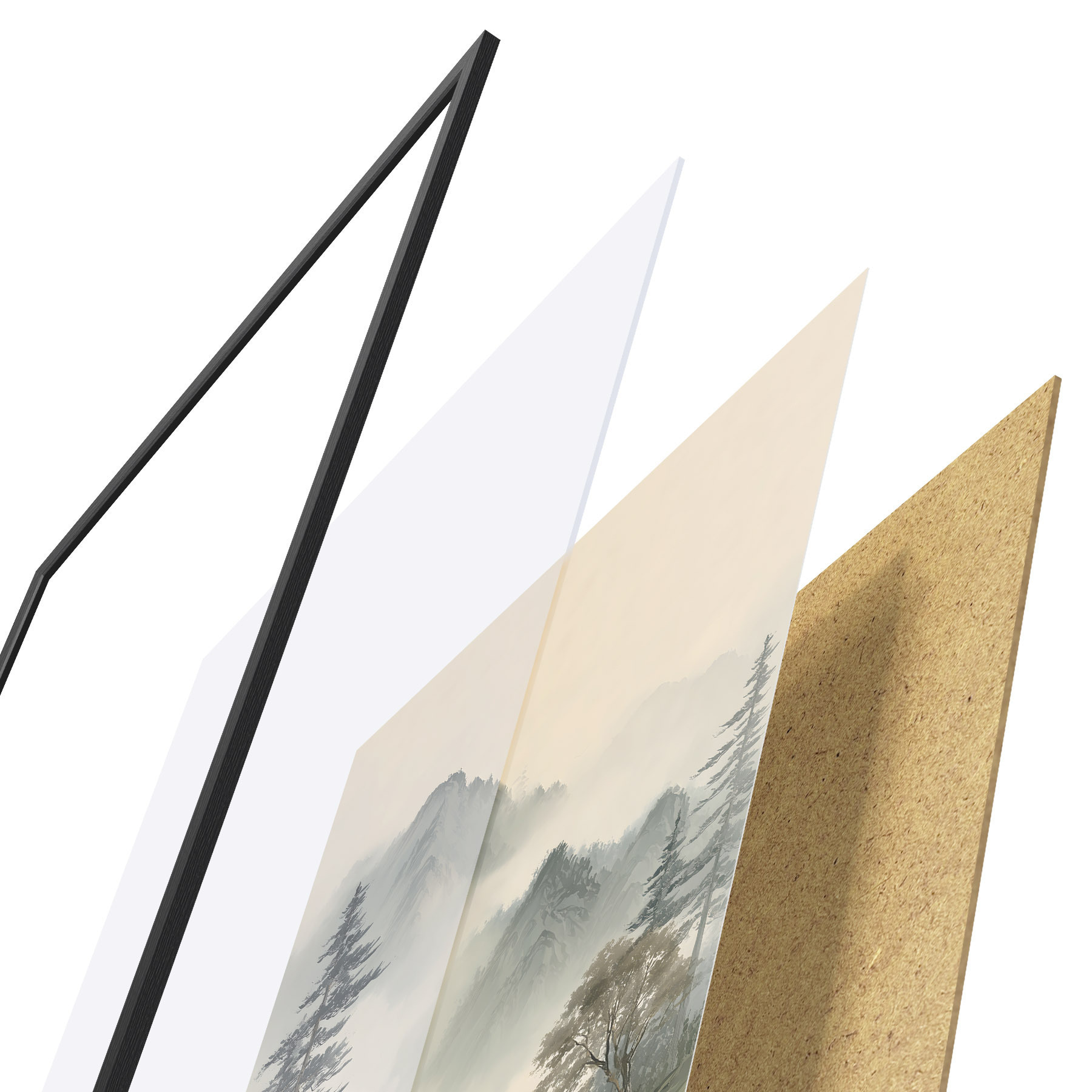 De poster bestaat uit een frame, plexiglas, geprinte afbeelding en spaanplaat achterkant. De poster kan meteen aan de muur worden gehangen dankzij de bevestigingen op de achterkant.