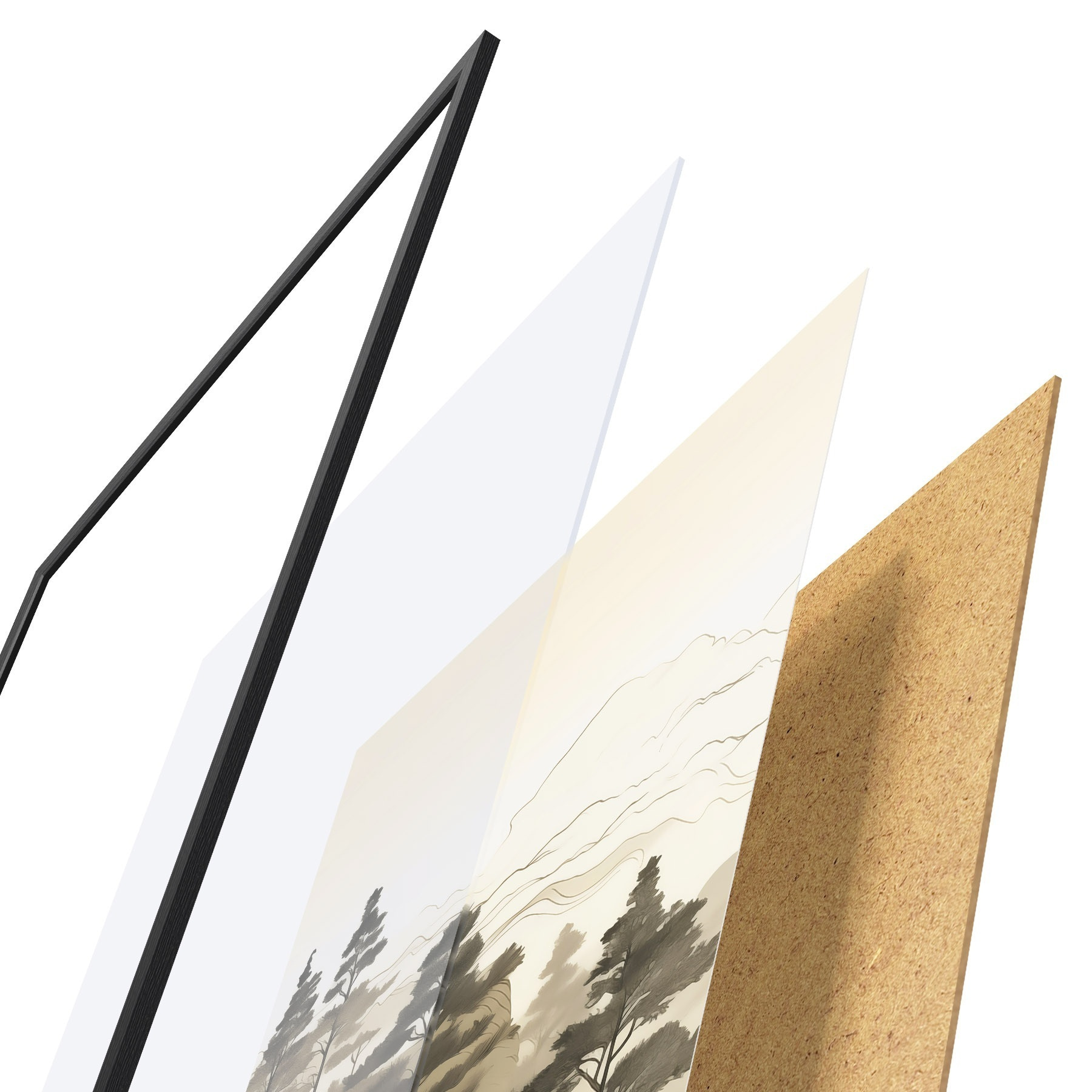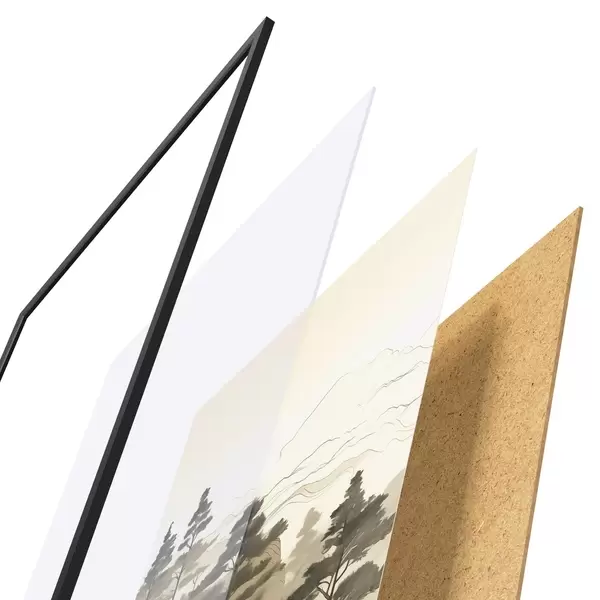 De poster bestaat uit een frame, plexiglas, geprinte afbeelding en spaanplaat achterkant. De poster kan meteen aan de muur worden gehangen dankzij de bevestigingen op de achterkant.