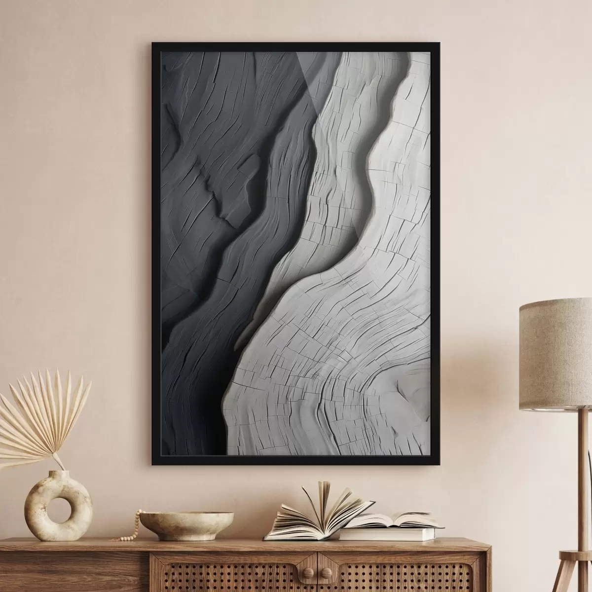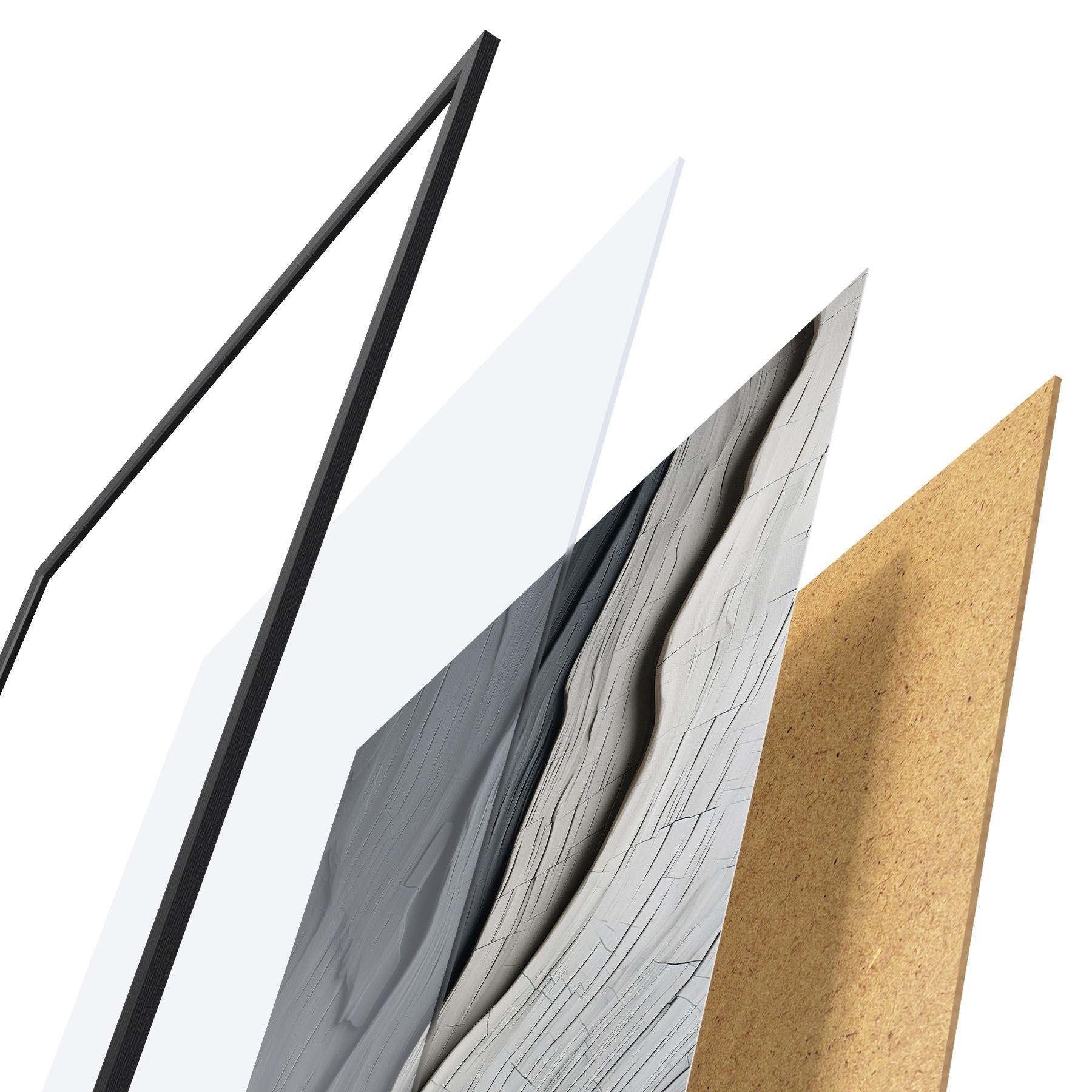 De poster bestaat uit een frame, plexiglas, geprinte afbeelding en spaanplaat achterkant. De poster kan meteen aan de muur worden gehangen dankzij de bevestigingen op de achterkant.