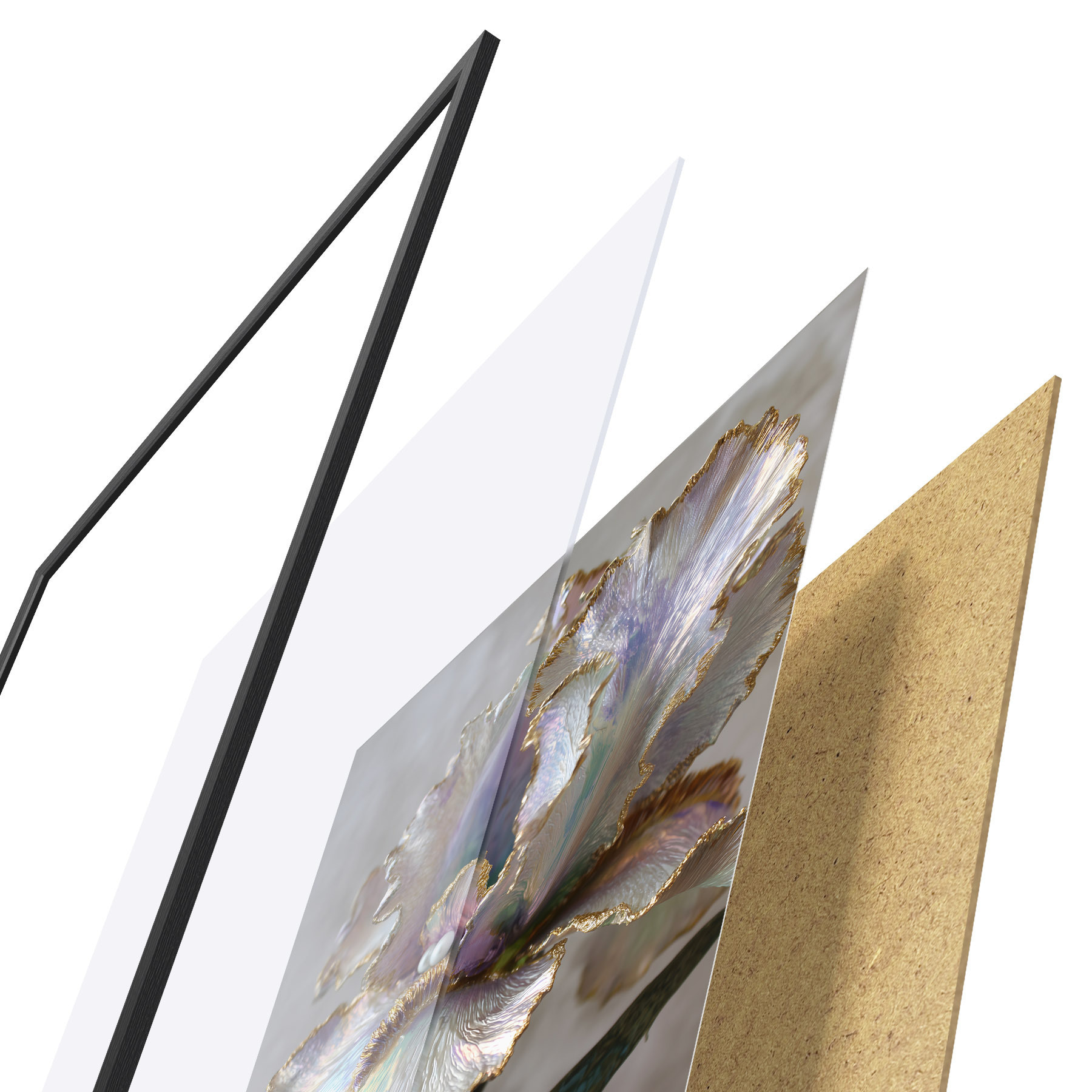 De poster bestaat uit een frame, plexiglas, geprinte afbeelding en spaanplaat achterkant. De poster kan meteen aan de muur worden gehangen dankzij de bevestigingen op de achterkant.